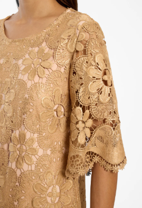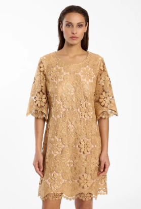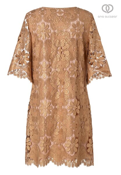This head-turning dress from German brand Ana Alcazar is a gorgeous piece of golden art; oozing luxury and opulence.  This elegant A-line dress with its knee-length silhouette has a regular fit that falls in a soft A-line—perfect if you want elegance with ease. The round neckline frames your décolletage in a classic way, while the half-length statement sleeves skim your arms in semi-sheer lace. Shimmering floral ornaments and textured embroidery make this piece truly mesmerizing while the golden colour is so flattering against the skin.  Pair with a metallic heel and bold earrings for any occasion from a wedding, cruising or date night.  Simply stunning!