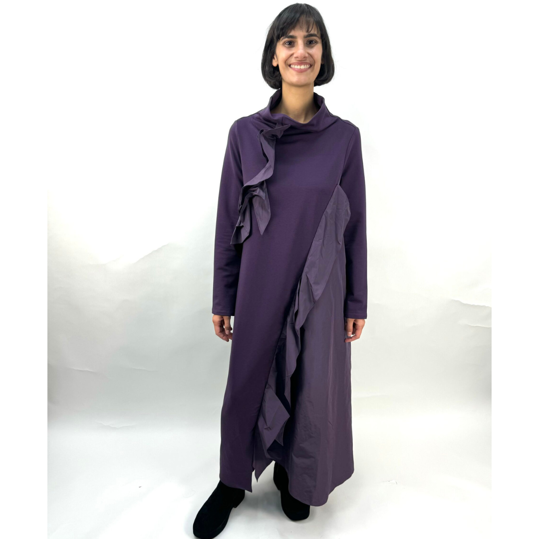 Perfect plum!  Tired of black and grey and navy…why not try this beautiful plummy purple instead.  This colour is so on trend this season, muted and not garish and in this dress, the combination of soft jersey and light taffeta really bring it to life.  The long sleeved dress has some notable features including a high neckline, a one sided, diagonal taffeta ruffle to the front running from neck to waist and skirt is made from half taffeta and half jersey again highlighted by a ruffle.  It is elegant, outstanding yet somewhat understated while the colour really makes it a stunning and unusual piece.  Effortless!