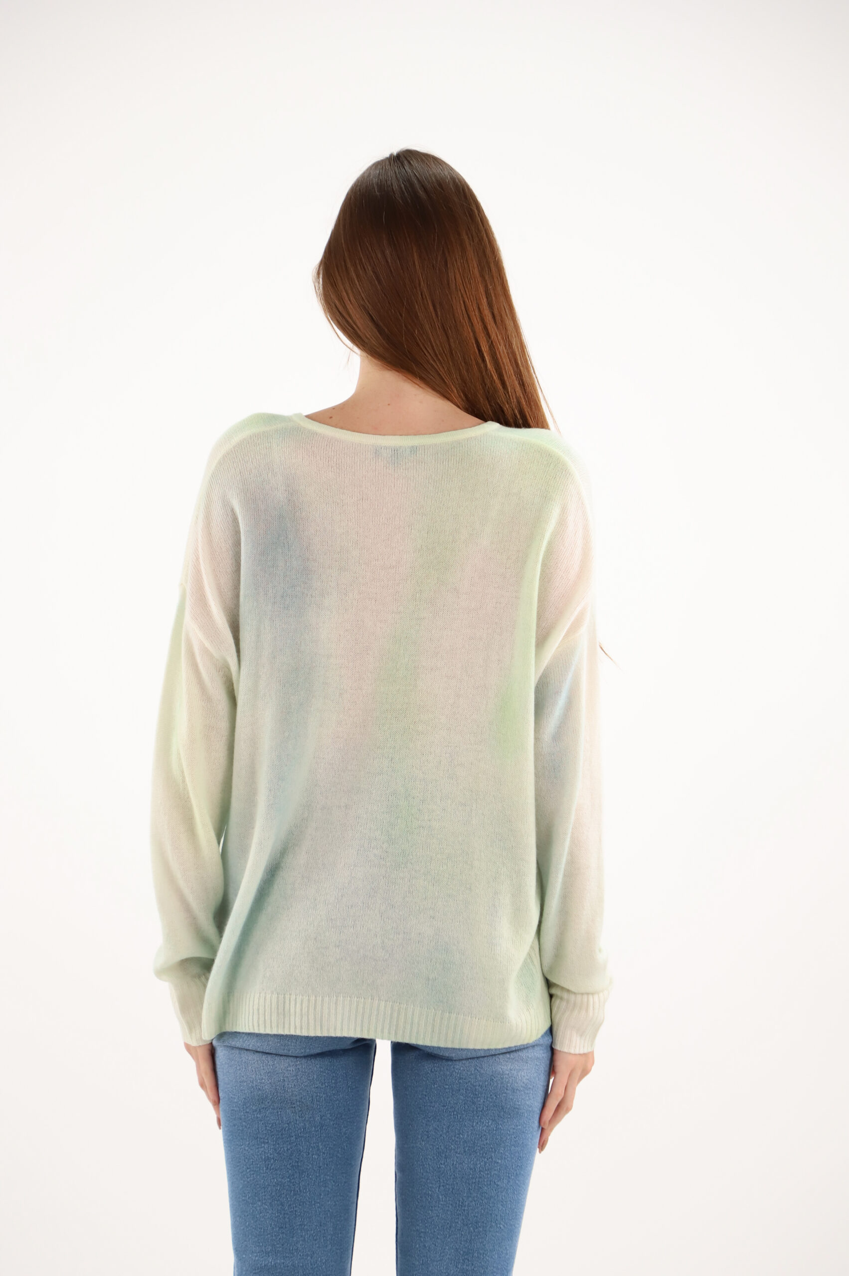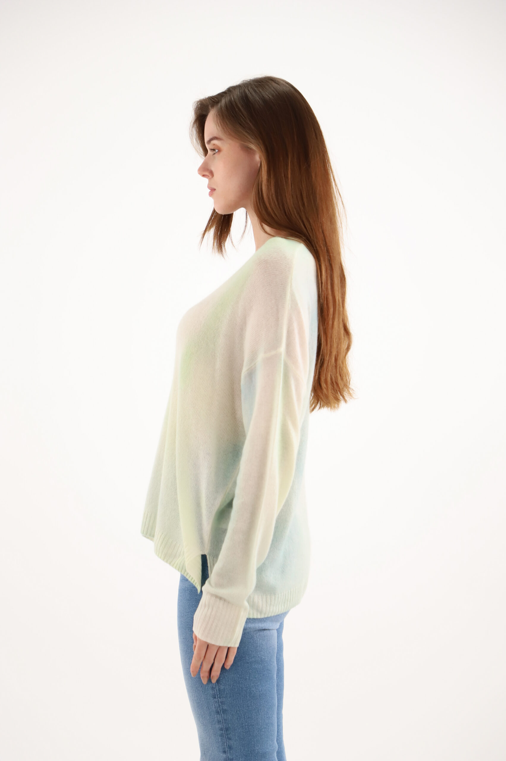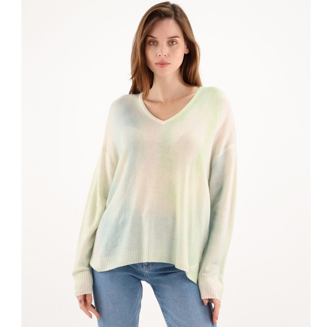 Gentle rainbow colours including green and blue come together so subtly in this beautiful sweater from French brand Estheme.  Crafted from a gorgeous 100% cashmere which is so soft to the touch, the muted colours in this lovely piece make it easy to pair with denim, cotton or linen for a stylish, chic vibe.  The relaxed fit, flattering V neckline and long sleeves from a dropped shoulder give it a cool Sunday morning feeling while ribbed hemline and cuffs add detail.  Brilliant for travelling as it is so lightweight to carry.  A cashmere hug from this lovely knit is fabulous!