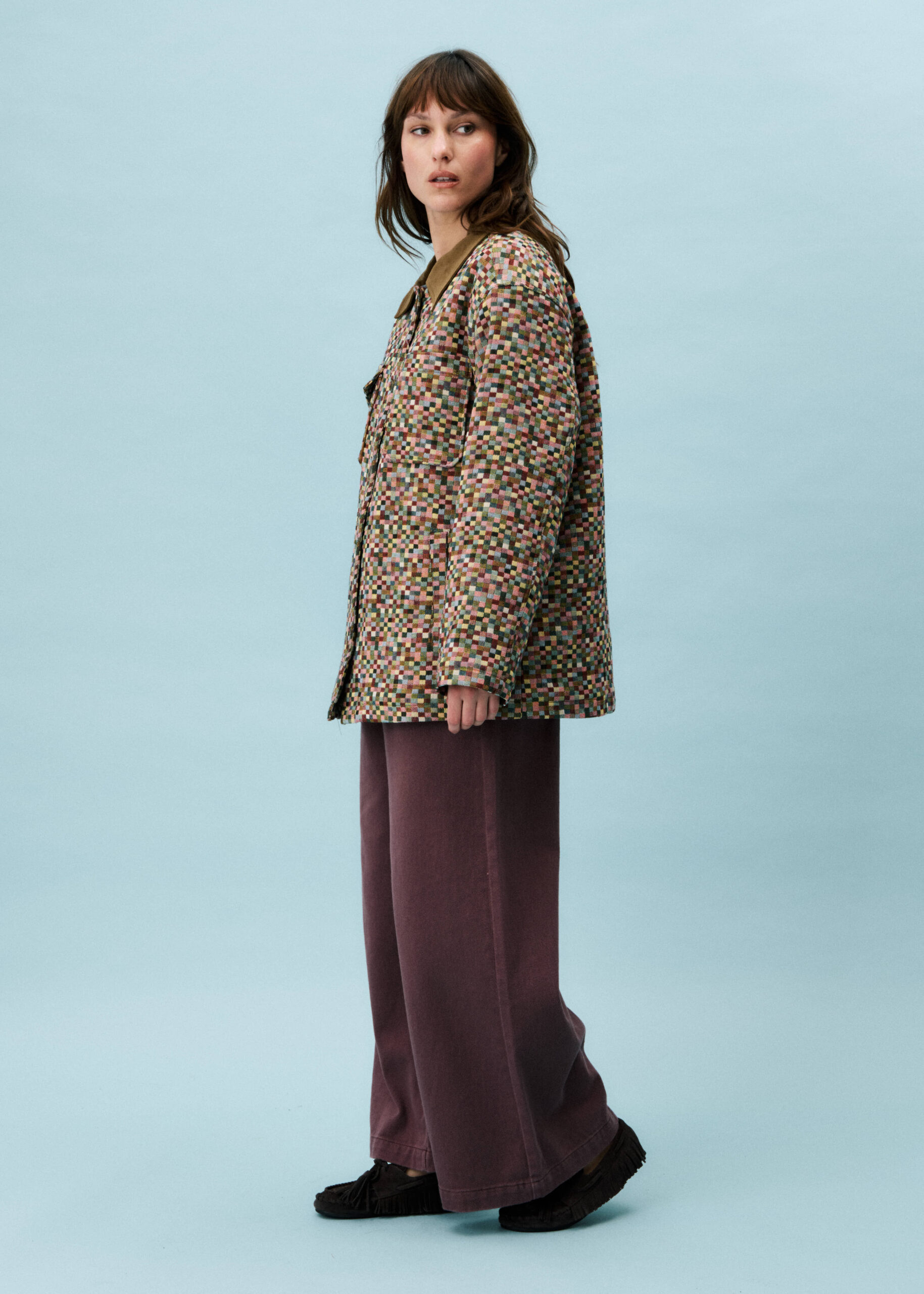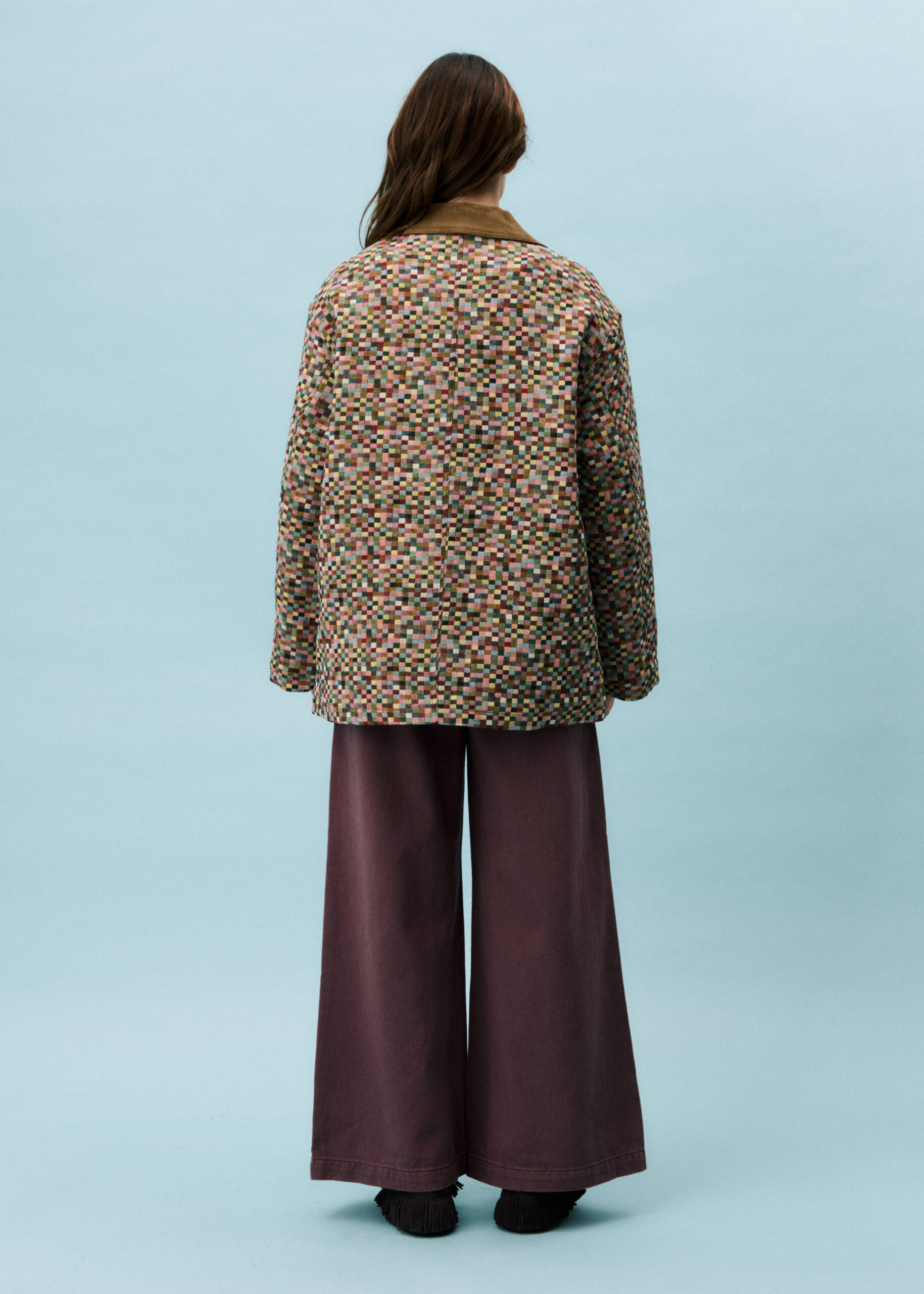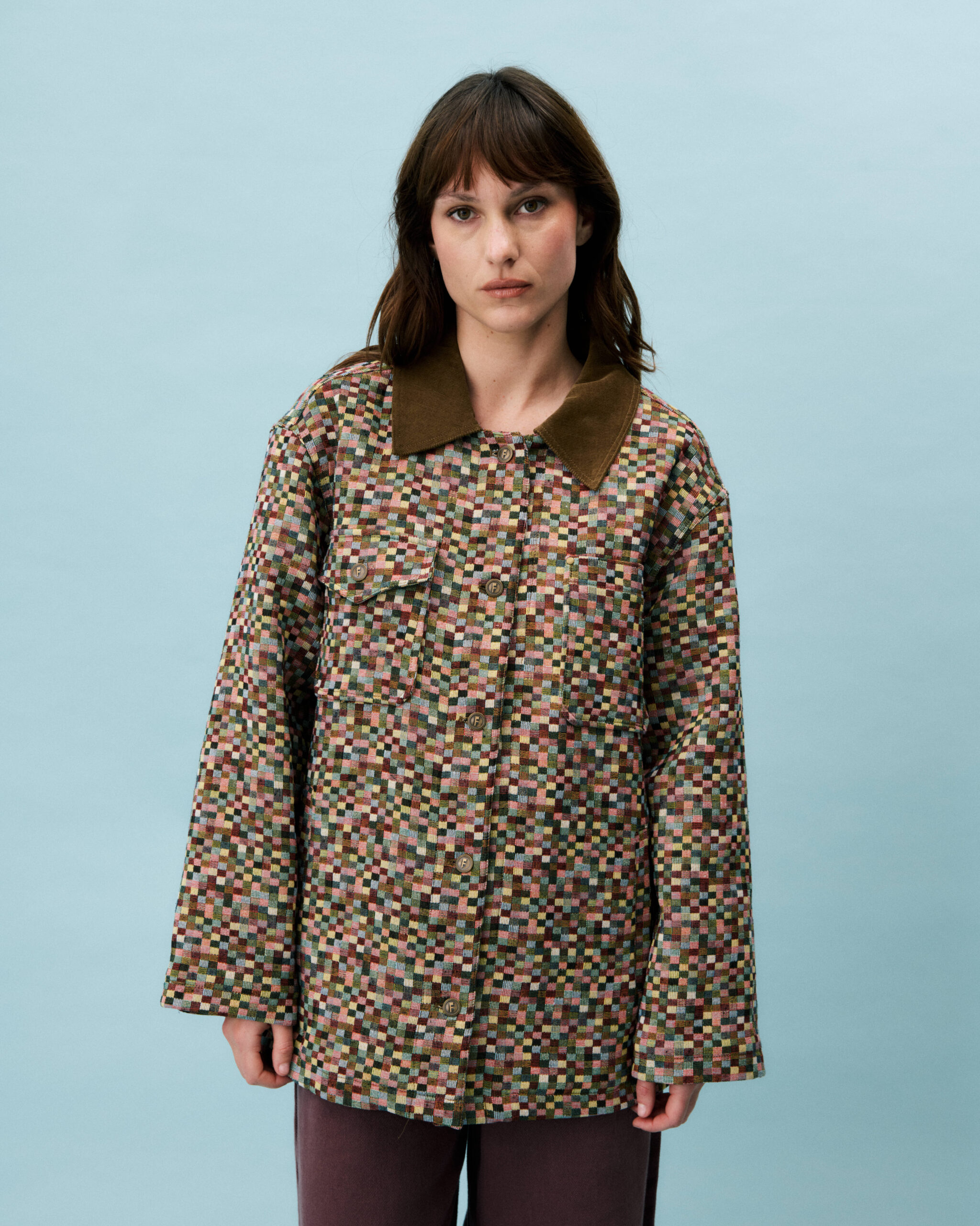 Tiny patchwork cubes of every colour blend in this gorgeous pixelated, lightly padded jacket from Frnch.  A super cool fabric which has a light textured feel shows off so many colours when examined closely but the overall vibe is gentle, muted and not garish.  The addition of a brown needlecord collar to the single breasted, buttoned styling along with the brass effect buttons and two pockets (one with a button closure), full length sleeves with a wide shape and a khaki lightly padded lining make this jacket a substantial piece.  Perfect for wearing with denims, or any fabric trouser, this is a stylish anytime go-to jacket that you will love from day one.  A great length too!