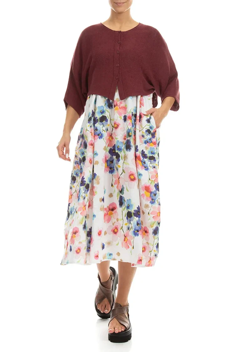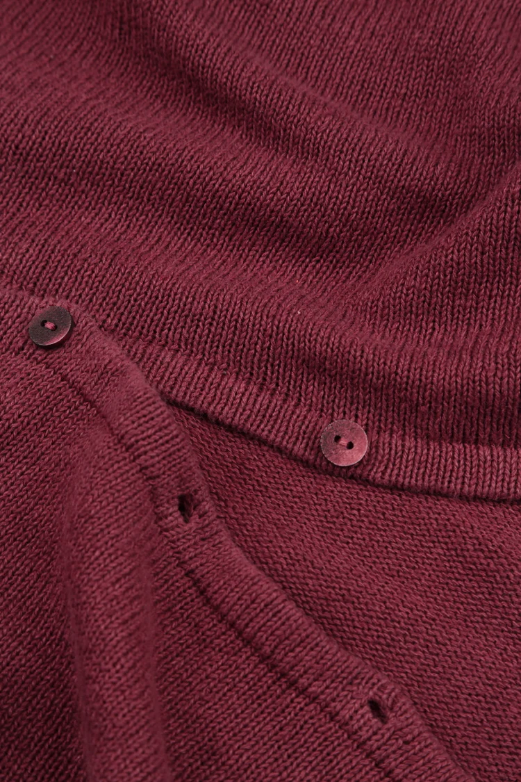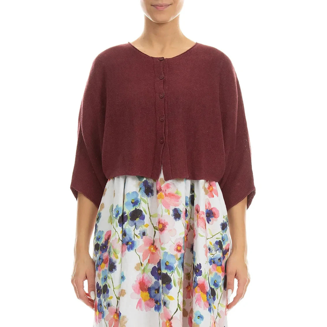 This gorgeous raisin colour is so on trend for this season and this brilliant cardigan from Grizas is such a great way to show it off.  Handcrafted from 100% natural linen, this cardigan is an ideal way to add a layer without the bulk and its short cropped design pairs beautifully with trousers or skirts as well as being the perfect partner to a summer dress when the sun goes down.  The design includes three quarter sleeves from a dropped shoulder, rounded back hemline, button closure and a relaxed fit.  The rich raisin colour pairs wonderfully with any neutral, denim and is so cool with a limey green.  A worthy addition to any wardrobe collection.