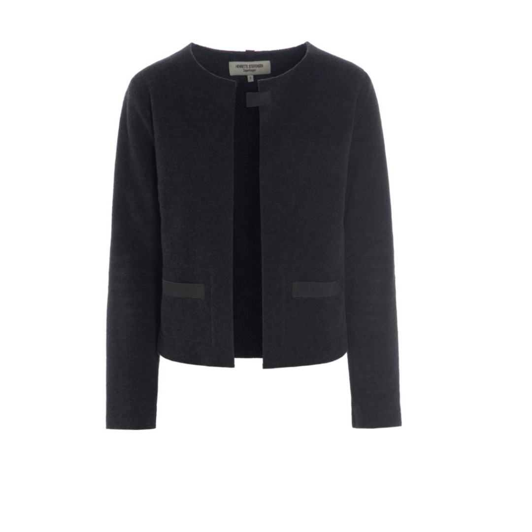 Inspired by Coco Chanel, this gorgeous short collarless jacket cardigan is crafted from the softest of fleeces and in a delicious chocolate colour.  Super soft the the touch and so comfortable, it has a short boxy shape, long sleeves and an edge to edge collarless front.  With the signature grosgrain bands of the Henriette Steffensen brand across each slit pocket, this jacket oozes femininity and looks brilliant with denims, tweeds or cords.  Such a different little jacket and ideal as a transitional piece to carry you from season to season in style.  Cool!