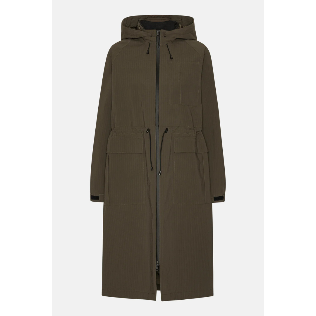 Every wardrobe should have a coat for wearing when the weather turns…and this gorgeous coat from Ilse Jacobsen is just the ticket!  This parka raincoat in a great khaki brown is designed for inclement weather, cold temperatures and heavy downpours. Crafted from robust ripstop fabric which has the faintest of pinstripes, this raincoat features an impressive 20,000 mm water resistance, 20,000 g/m2 breathability and exceptional insulation. Lined with thermal padding, this coat provides warmth, without adding additional bulk. The coat’s loose fit, raglan sleeves, oversized patched pockets, elasticated cuffs and the option to adjust the waist make it a perfect choice.  Style it your way and this is guaranteed to keep you warm, dry and oh so stylish!