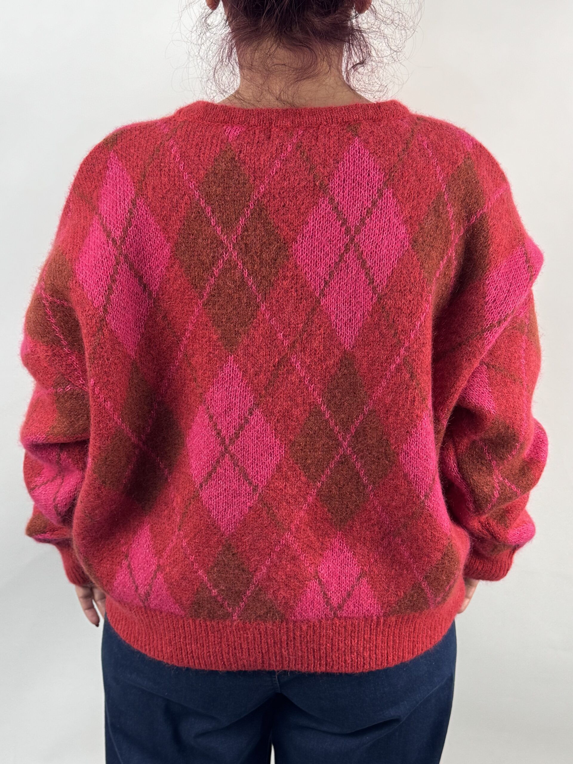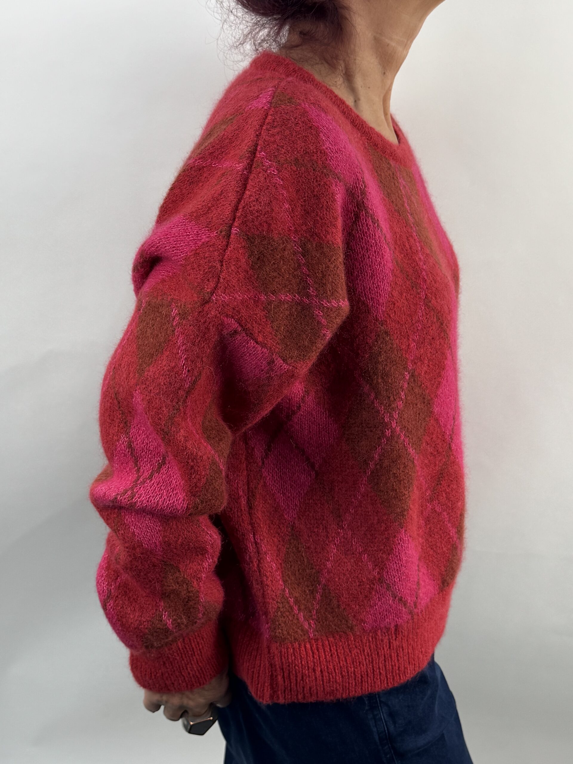 This gorgeous sweater from KnitKnit will keep you toasty warm as well as so stylish!  In wonderful colours of fuchsia, ruby red and a touch of claret, this interesting sweater boasts a Duke of Argyll diamond pattern which originated as the the tartan of the Clan Campbell of Argyll and became fashionable after the Duke of Windsor popularised it for golf in the 1920s.  You don’t have to play golf to own this beauty although it would be super chic on the golf course!  It is crafted from a beautifully soft wool blend, and has simple relaxed shaping with a round neckline, ribbed hemline, long sleeves with ribbed cuffs and a mid hip length.  This pattern may have been around for a while but this sweater is bang up to date and fabulous!