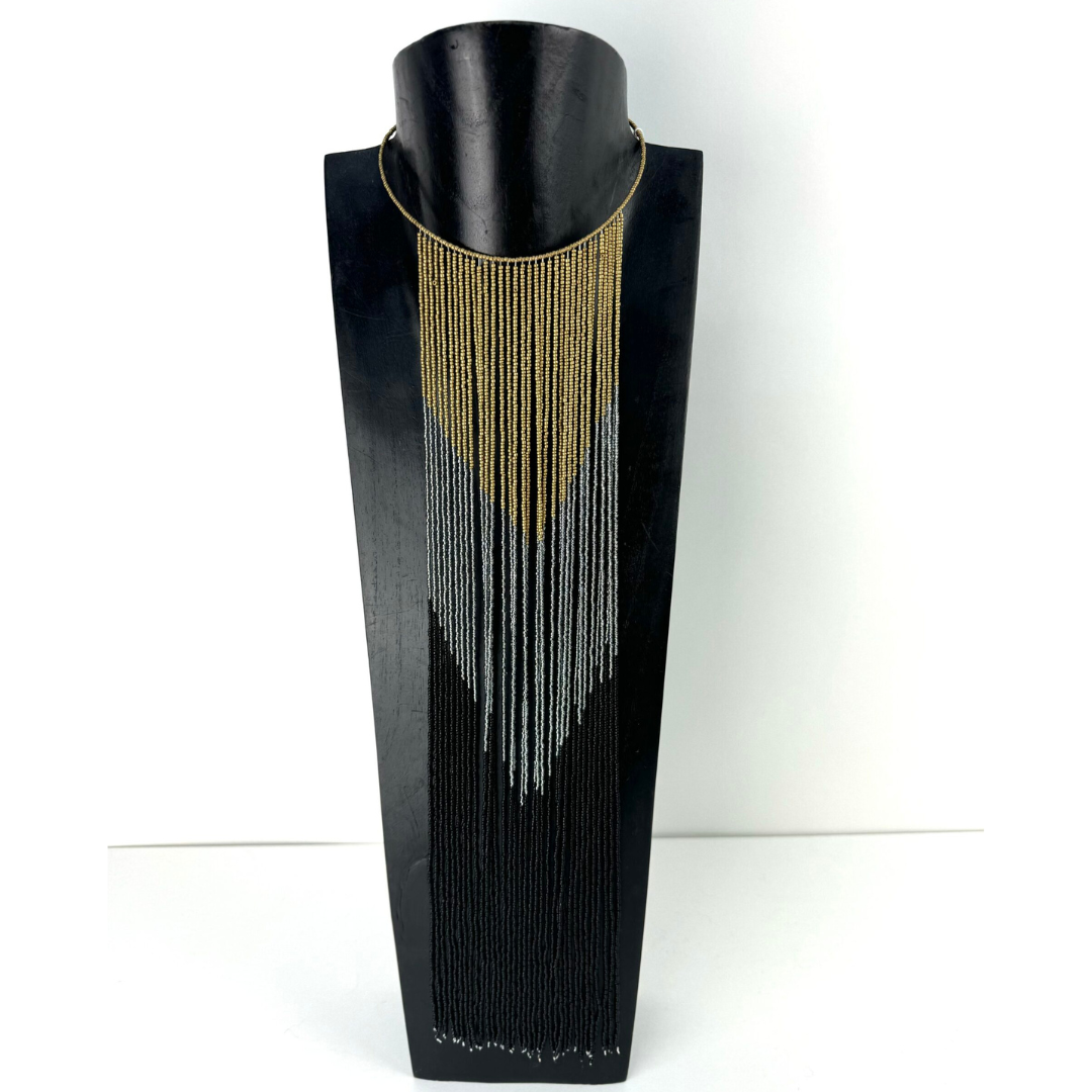 Reminiscent of the 1920’s, this glamorous necklace is light to wear and tactile.  Strands of tiny gold, silver and black beads are strung on a circular beaded wire that sits at your neckline while the strands sit on your décolleté.  The colours of the beads are arranged in such a way that there is V shape which together with the long styling of the whole necklace makes it so flattering.  Fluttering movement yet sleek and chic!  Perfect for adding interest to that LBD!