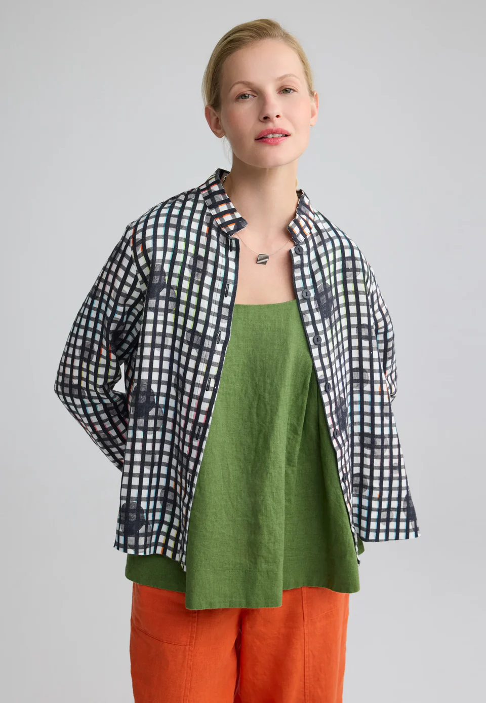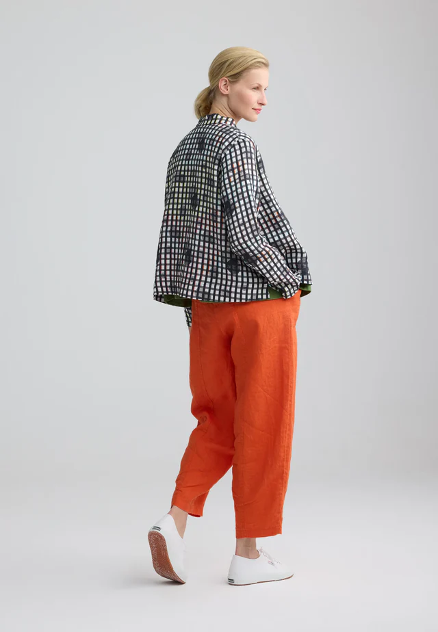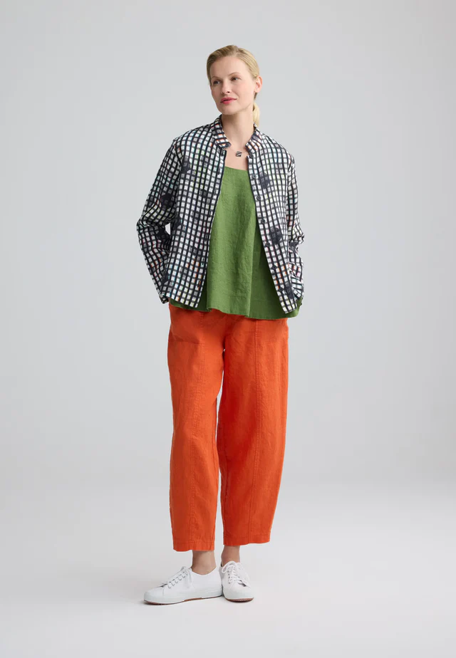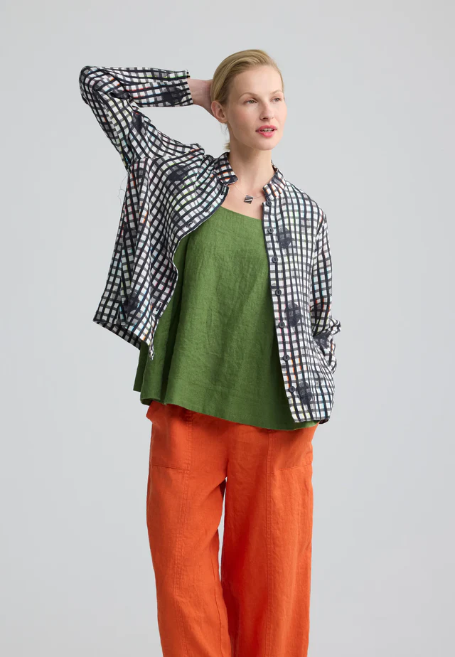 This fabulous shirt is crafted from pure linen and brings an Oriental vibe with a flattering short high collar and buttoned front.  In monochrome colours of black and white and with a gingham check, it has all the makings of a classic design; then overlay a circular, shadow dot pattern with just a touch of colour to the check and result is so striking and stylish.  A relaxed shape to mid hip with long sleeves without a cuff and side splits to complete the design, this shirt can be worn buttoned for a more puritan look or wear it open as a layering piece.  The addition of colour to the check makes it easy to pair with any trouser from denim to cotton or linen.  A gorgeous chic addition that you will love the wear!