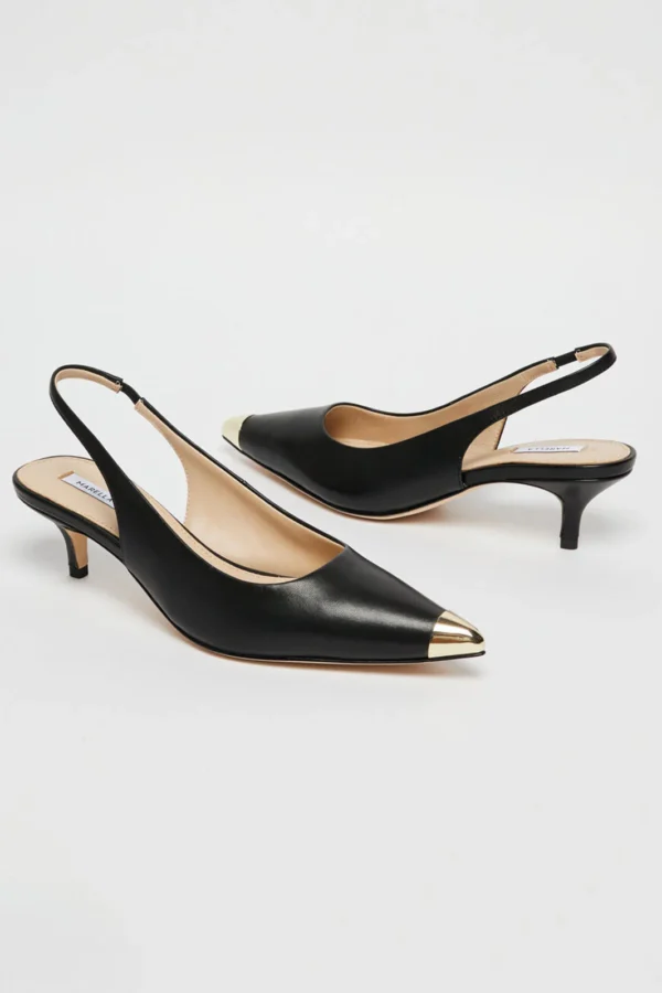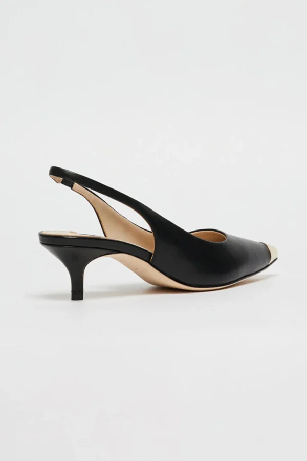 Classic timeless elegance is guaranteed with this shoe.  A brilliant slingback design that is hard to improve upon but with the gorgeous addition of a gold toe tip.  The little kitten heel ensures comfort and style and in classic black, these shoes will elevate any outfit.  Perfect with anything from a cigarette trouser, to a tailored suit to wide legged denims.   So stylish!