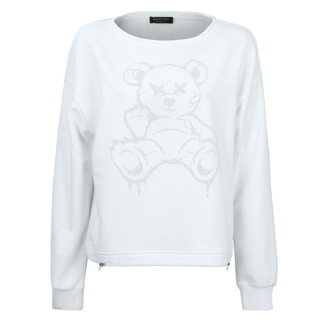 This gorgeous sweatshirt top from German brand Margitte is crafted from a soft cotton which is so smooth to the touch.  In a brilliant white and with a lightweight feel it is great for layering over a shirt or under a gilet but also perfect as a stand alone piece.  A picture of a beautiful bear is embossed to the front of the top in tiny white beads and the effect is so subtle and stylish.  A classic shape with a rounded neckline, long sleeves with ribbed cuffs and the hemline has a drawstring should you wish a more gathered look.  Fantastic and easy to pair with cotton trousers or your favourite denim, this bear deserves going home with you!
