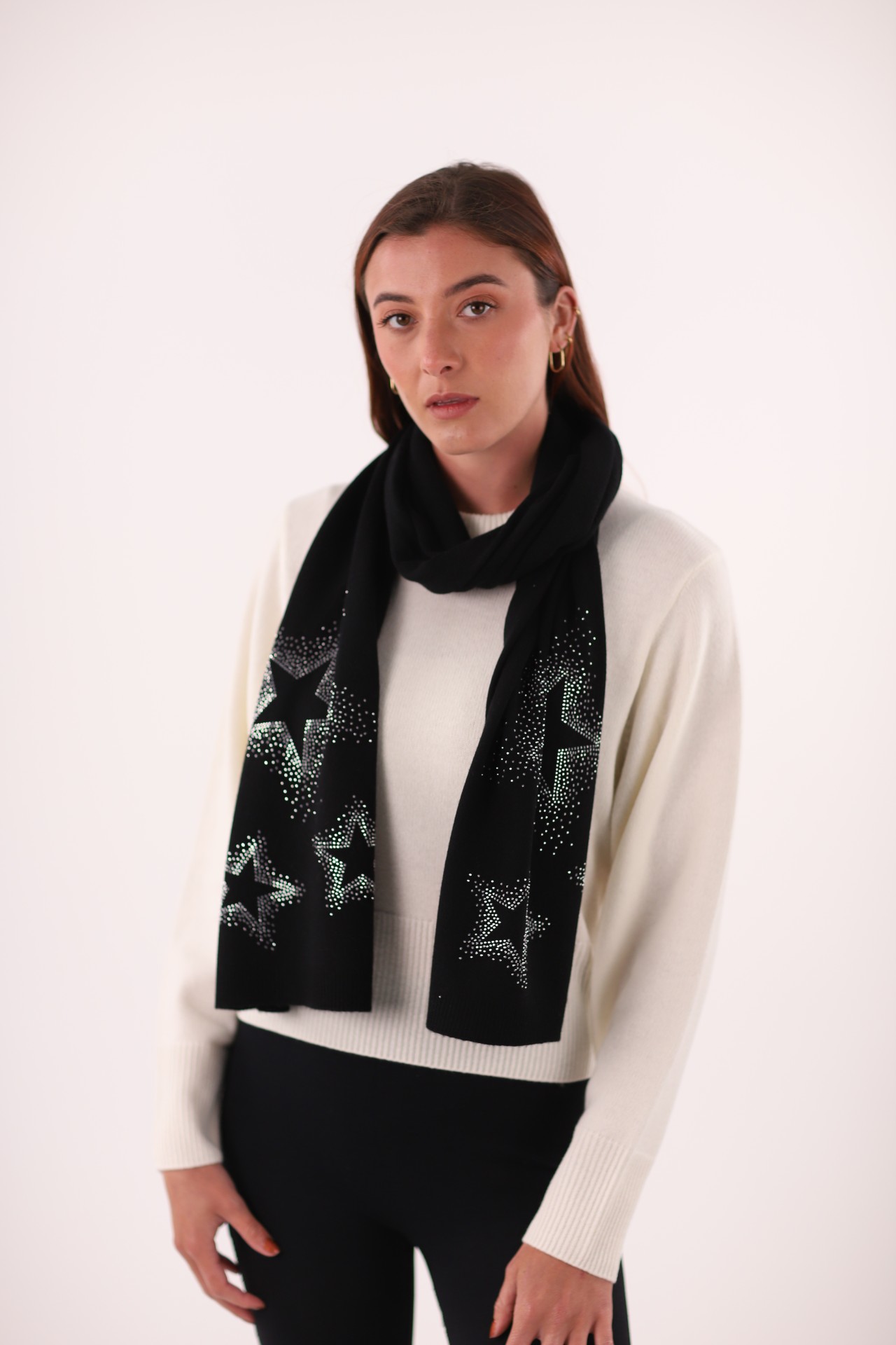 Add a touch of sparkle to your look with this lovely sweater from Maud & Sacha.  Crafted from 100% Merino wool, it is so soft to the touch, jet black and the simple styling of a round neck, long sleeves and a mid hip length makes this a comfortable, stylish wear.  The addition of a collection of sunburst stars in tiny diamanté to the top right side makes this an interesting, fun piece.  Pair with satin or velvet trousers for the perfect ensemble for parties, drinks or festive get togethers or with denim for a cool, chic vibe.  The matching scarf adds a superb finishing touch too!  Brill!