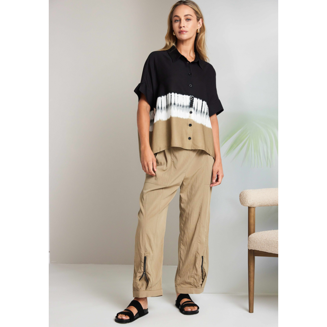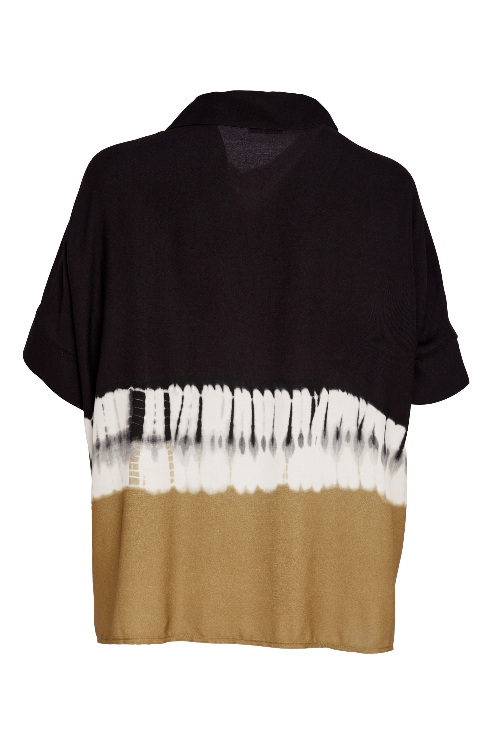 Tie-dye for the 21st century!  This gorgeous shirt from Naya is in a brilliant colour combo and a lightweight fabric with lots of movement.  With a wide boxy fit in black, white, grey and with a touch of a rich tan, this shirt has all the classic features such as a pointed collar, front buttoned placket and short sleeves which have a slit in their hemline to add interest.  The mix of colours via the tie-dye process moves from black to white via grey and then finishes with tan which gives this shirt a modern and contemporary take on a 1970s look and when paired with trousers in the same range, the result is super stylish and relaxed.  This piece will slip easily into your existing collection, for sure.