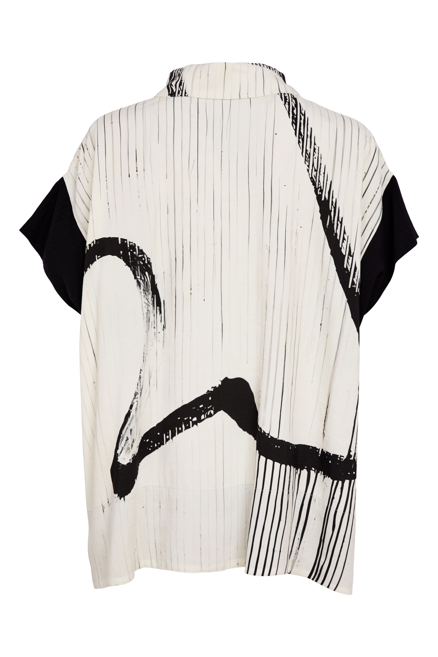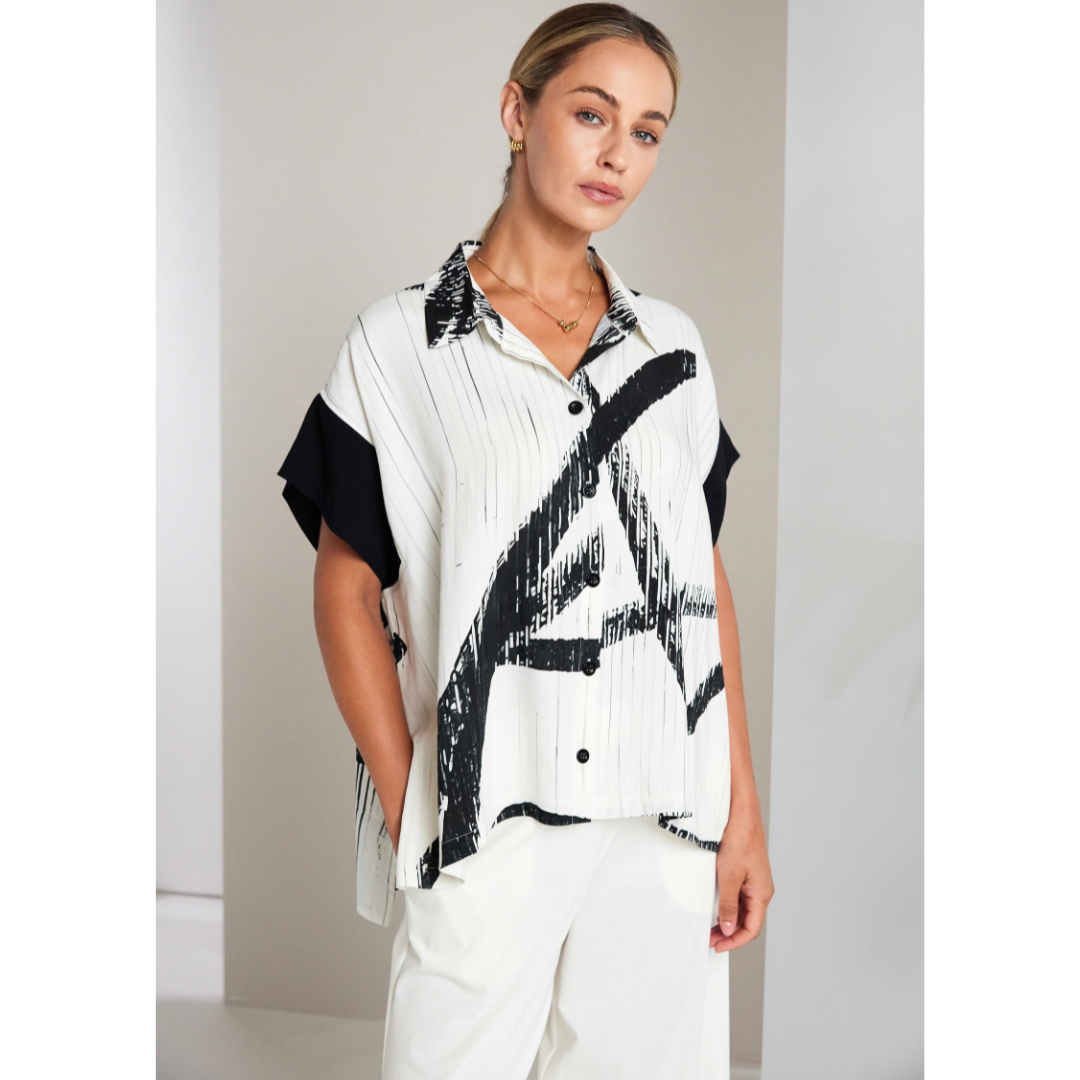Crafted in a lightweight, smooth fabric this brilliant shirt from Naya will blend into your existing collection with ease.  A relaxed, wide, boxy shape gives this piece a modern feel while the classic colourway keeps it looking sharp and contemporary.  Black brushstrokes against a white background that also features tonal grey and brings lots of interest without being overbearing.  This shirt will pair so well with trousers in the same range or your favourite denim.  A classic shirt collar, buttoned front placket and short sleeves with feature stitching and in solid black to add contrast gives this shirt such a cool design.  A favourite from minute one!