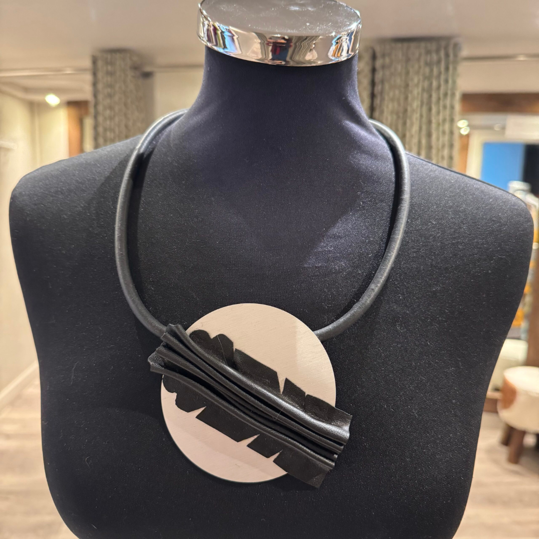 Bold yet lightweight!  This brilliant necklace brings a bold look as a single rubberised cord suspends a disc of brushed silver metal which is further enhanced by the addition of a black leather feathered shape.  Perfect for those who like a minimalistic or monochrome look, this necklace measures circa 22 inches and looks great with a plain T, your favourite cashmere or to add a touch of drama to a little black dress.  A magnetic clasp makes it easy to put on and take off too.  A statement necklace that isn’t too heavy to wear – fantastic!