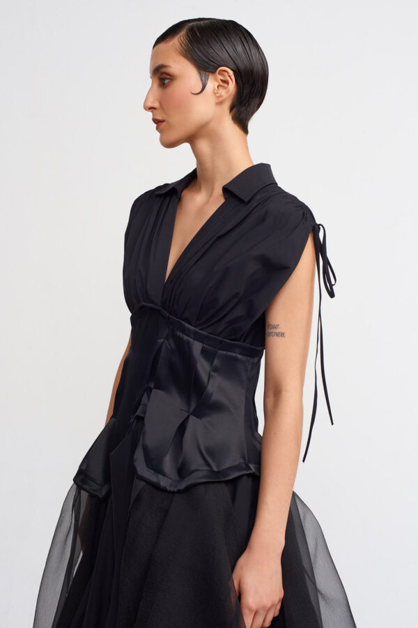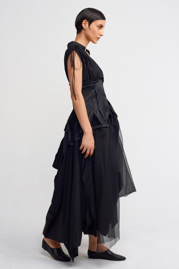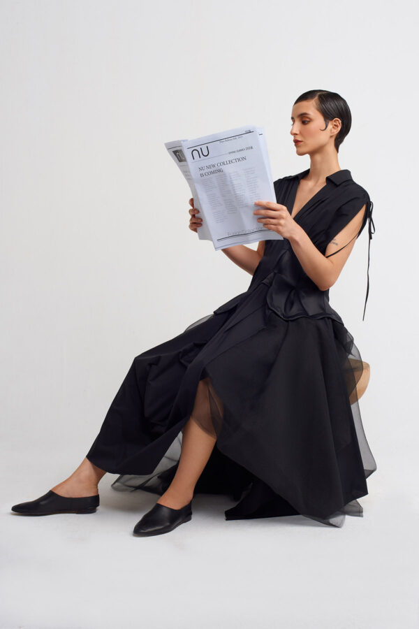 Wow! This is a real showstopper!  This gorgeous black dress from Nu is anything but ordinary – with a beautiful satin corset to cinch you in, an amazing full skirt in fabrics including wonderful netting and which is asymmetric and caught up in layers.  Add to this a shirt collar deep V neckline and a gathered capped sleeve which can be lengthened should you choose and the result is certainly one to remember.  This dress has a Cinderella feel but in a grown up way and you’ll certainly go to the ball!