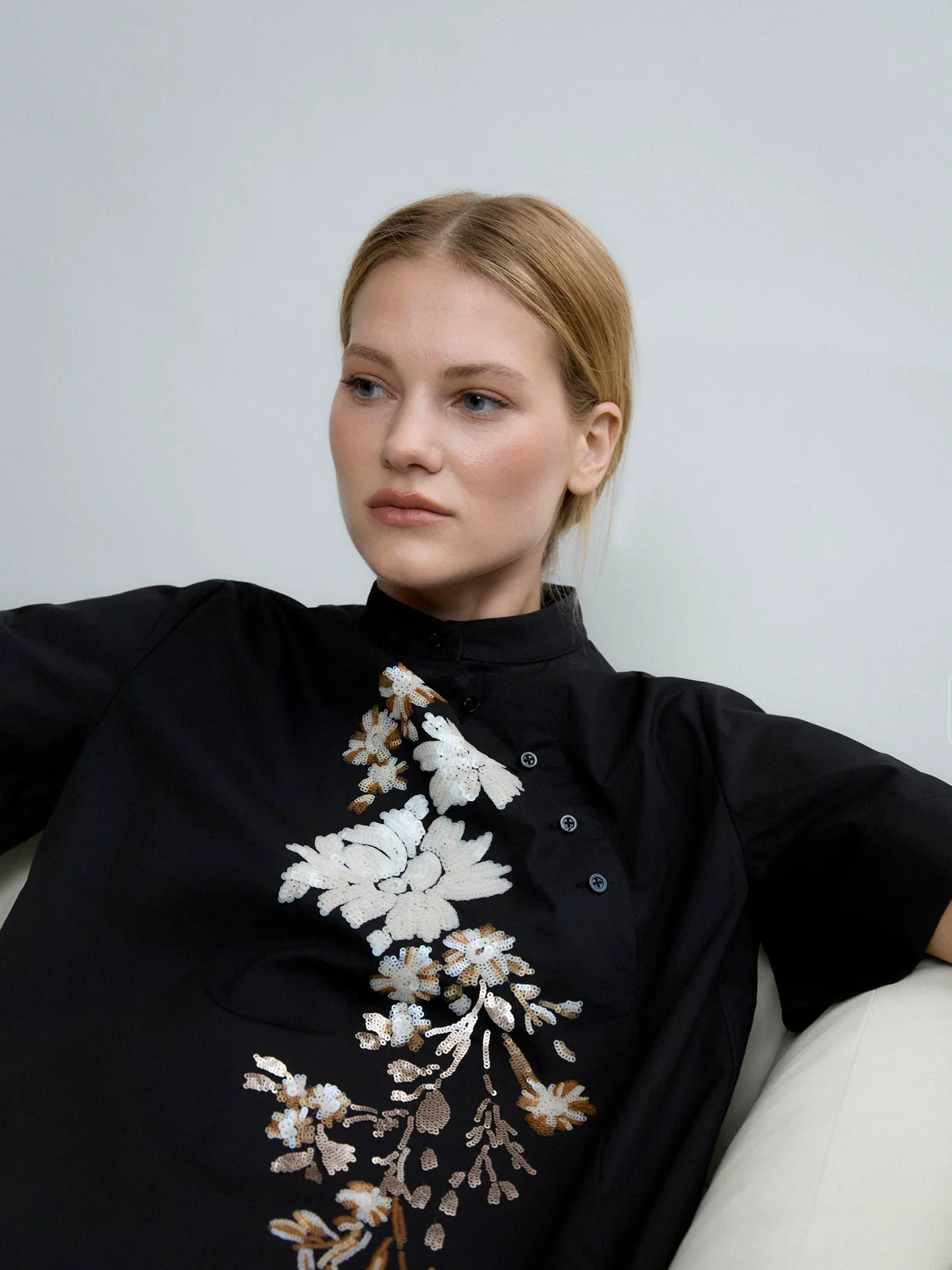 This stunning dress from Spanish brand Psophia brings a simple A line design to life, with a distinctively Oriental feel together with the most marvellous array of sequin adornment.  In jet black, which makes this dress all the more striking, the A line design is exaggerated by the short Mandarin collar, the short set of asymmetric buttons that run to one side and the short sleeves.  The fabric, which is a wonderfully smooth cotton poplin, makes this dress lightweight and comfortable to wear while lending some structure to the look.  However, it is the sequin embellishment to the length of the dress that takes centre stage.  The sequins are not shiny or garish; the colours are a soft, muted combination of creams, pale gold and a toffee caramel which sit against the black background in such an elegant and sophisticated way.  The floral pattern again has a Far Eastern feel and whole look is superbly stylish.  In seam pockets to either side and a side split to the knee complete the design.  Perfect for any occasion, holiday or even with trousers underneath and a sandal.   All in all, this dress is a beautiful, fabulous piece that will gain compliments from minute one!