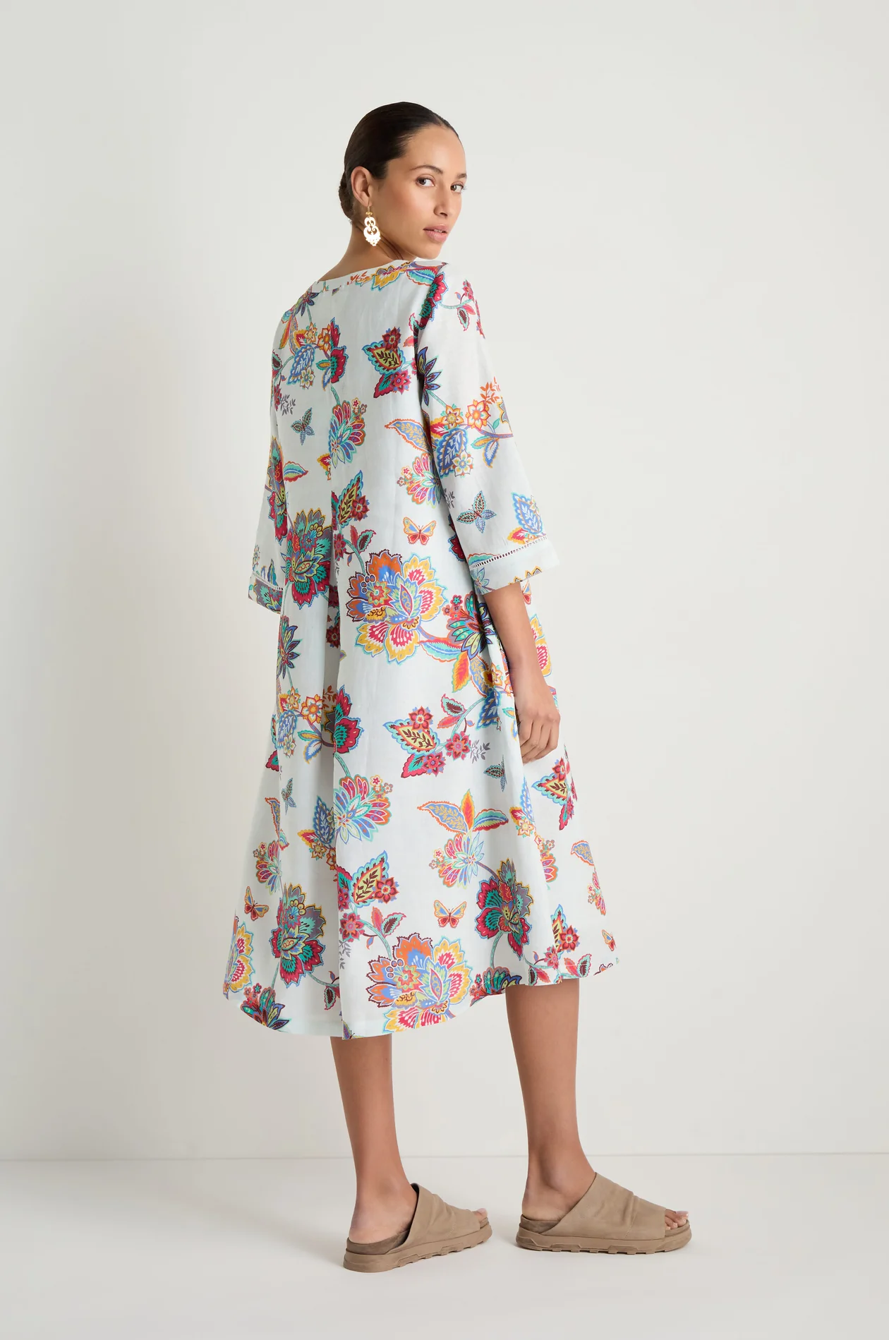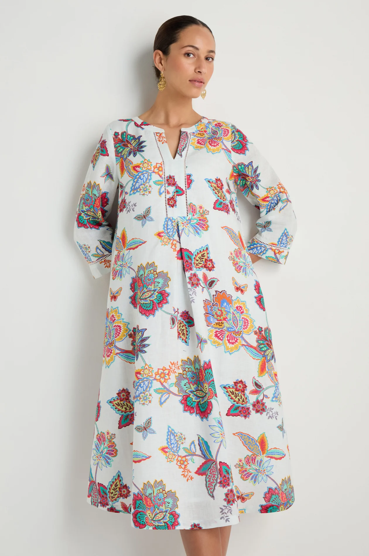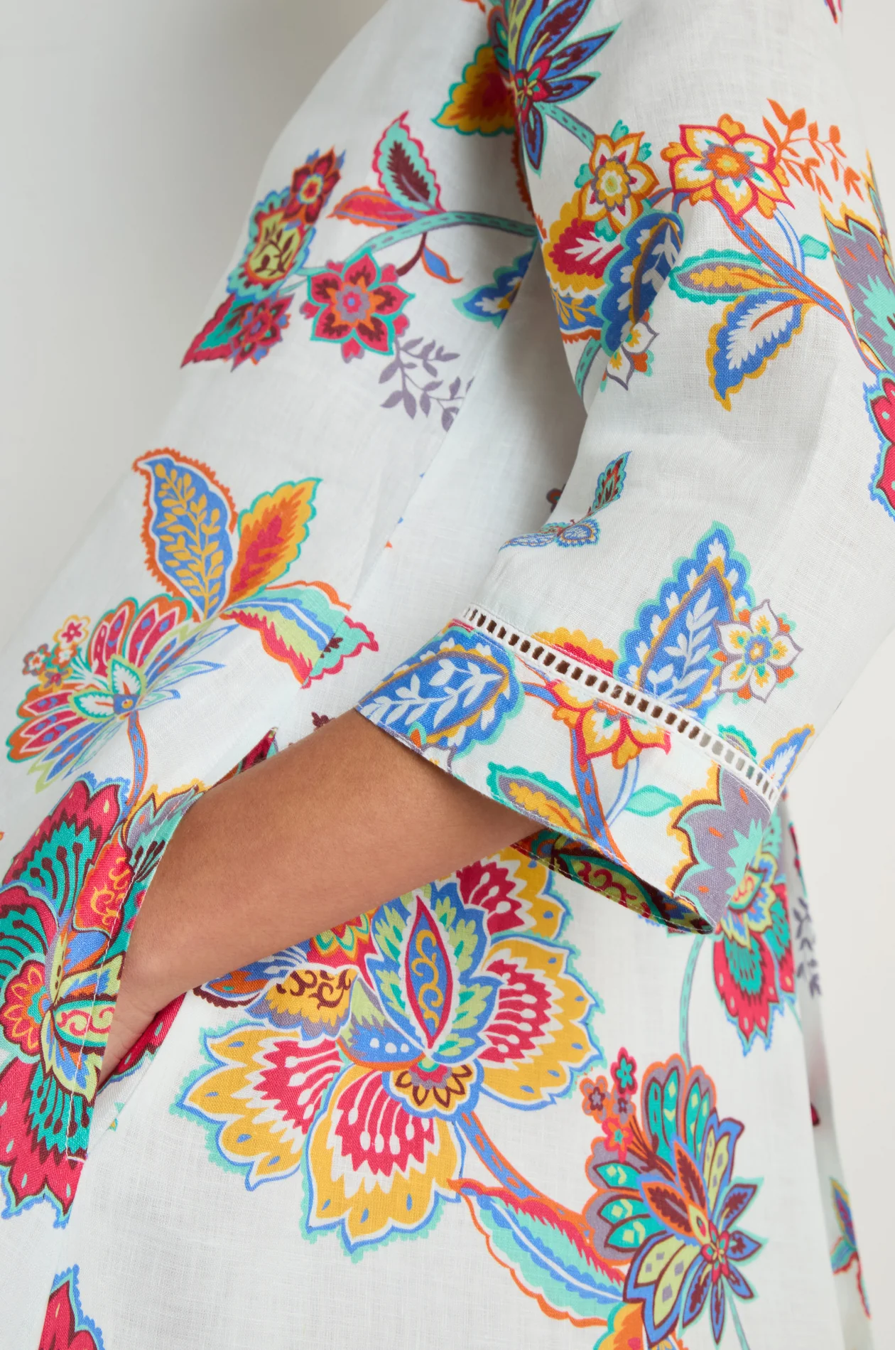 Simply stunning! This beautiful dress from Sahara is crafted in pure white linen with a Sarasa-inspired colourful, botanical print which flows over the entire piece.  With a flattering flared shape which is more fitted across the bustline, the pleats to front and back allow movement and sway while the midi length make it ideal with any shoe or sandal.  The neckline adds interest as it is rounded with a V shaped notch and the three quarter wider sleeves bring an elegant feel and more coverage.  Ladder embroidery detailing to the neckline and cuff is a fabulous finishing touch which is subtle yet with great effect.  This dress is perfect for any occasion from a garden party, to lunch with friends or sipping cocktails at sunset on holiday.  Interesting and stylish…this dress is a must for summer.