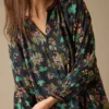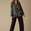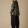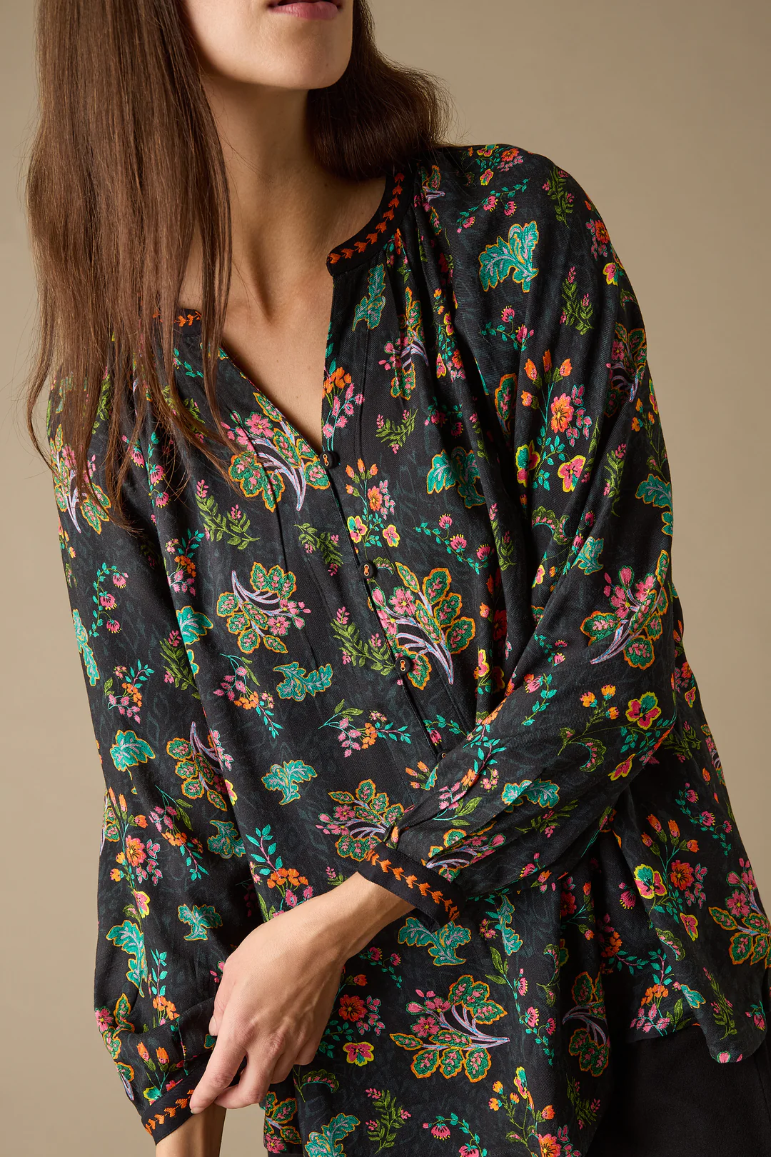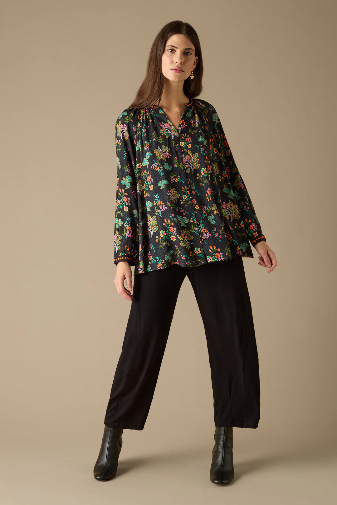 Pretty, feminine and effortless!   Add a touch of art and colour to your wardrobe with this lovely top shirt from Sahara.  Every colour comes together beautifully in this hand drawn floral print against a black background which gives a great flowing silhouette too.  A super length for wearing with trousers, long sleeves and a rounded notch neckline make it an easy wear, while embroidered hemlines at the neck and cuff together with looped buttonholes add stylish detail.  A super all rounder which which can be layered and dressed up or down.  Perfect!