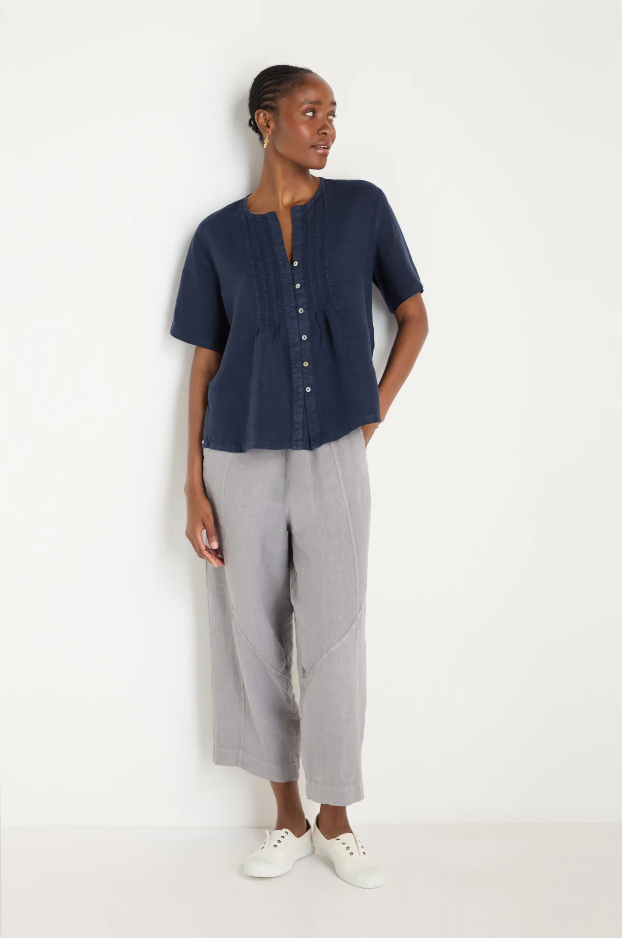 This pretty, feminine shirt from Sahara is crafted from fine linen which is lightweight and smooth to the touch.  Balancing structure with relaxed comfort, this beautiful inky navy makes it perfect for everyday style.  A gentle flared shape to mid hip and with short sleeves, this gorgeous shirt looks brilliant with denim or linen and the addition of lovely shell buttons with loop fastenings to the mini pleated front with its rounded neckline, brings such detail to the look.  Interesting and stylish, this is a great addition to your spring/summer collection.