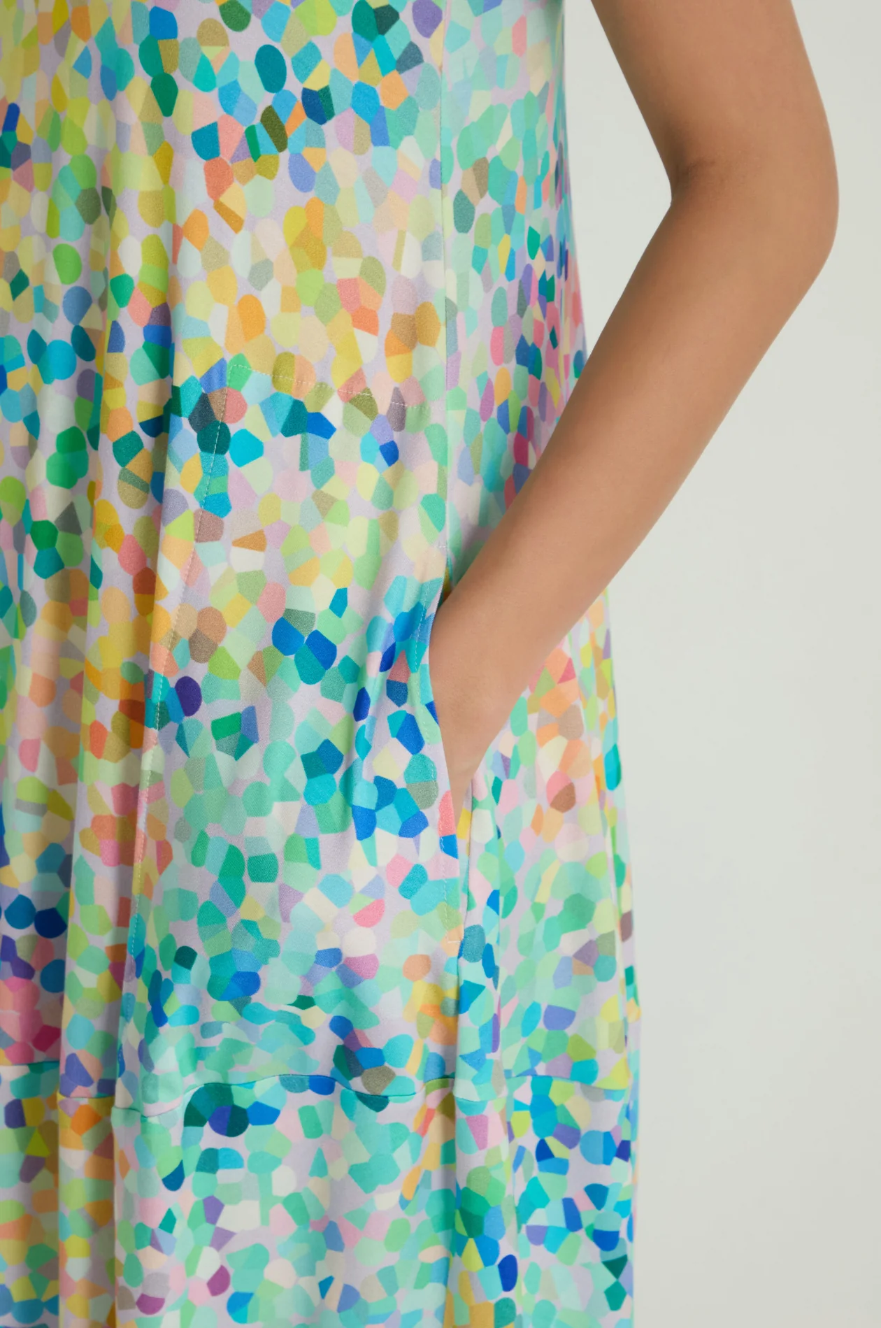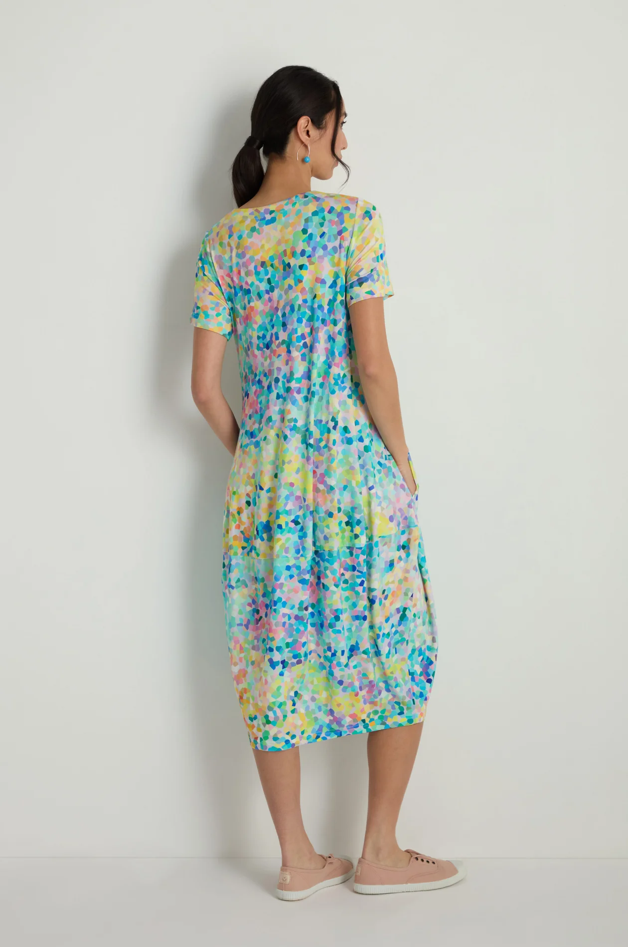 Beautiful colours and Sahara’s signature bubble shape make this dress a winner for summer.  Soft fluid jersey, a smooth touch and a good amount of stretch together with a relaxed fit, short sleeves and a flattering V neck makes this dress so comfortable while the confetti blurred print adds a fresh and interesting vibe.  Bright colours of lime, turquoise, pink, lilac and blue blend and merge to such effect.  This dress with its bubble shape adds volume while maintaining a relaxed, wearable feel; and there are pockets!  An easy go-to for any occasion from lunch out with friends, to date night to tip toeing along the sand on holiday.  Gorgeous with a capital G! .
