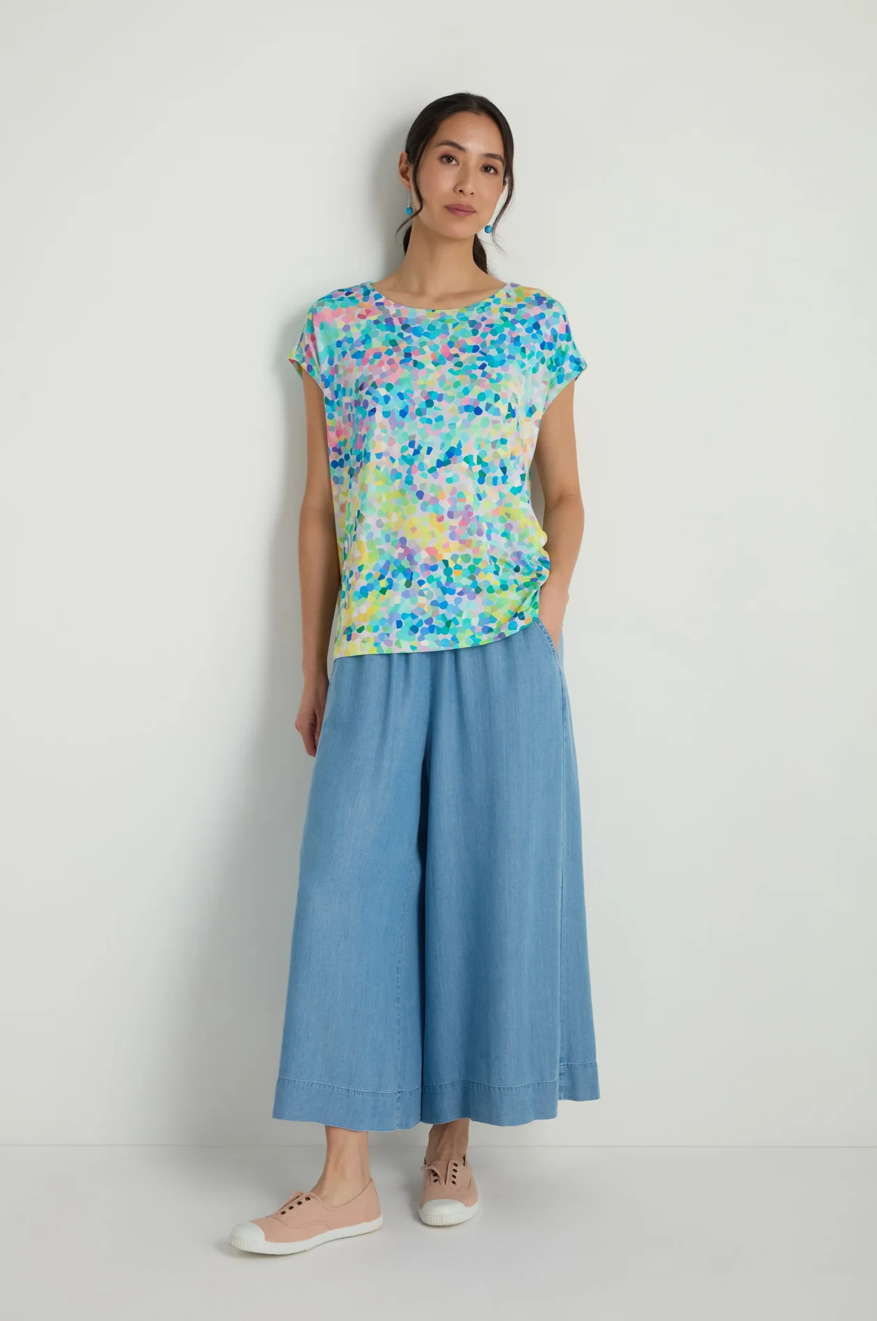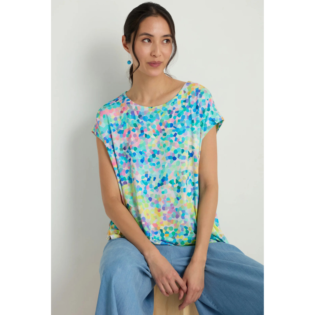 Soft fluid jersey, smooth touch and a good amount of stretch combine with a wonderful colour palette to make this beautiful top so comfortable and wearable.  With a relaxed, drapey fit that gives a boxy shape, the confetti blurred print adds a fresh and interesting vibe.  Bright colours of lime, turquoise, pink, lilac and blue blend and merge to such effect.  Perfect for elevating your favourite denim or linens, this top has capped sleeves and a wide, slightly scooped neckline.  Easy and stylish, this is a summer go-to.