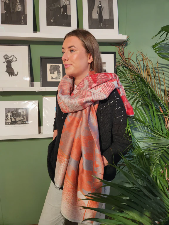 The perfect scarf for those that choose not to or can’t, wear wool.  Crafted from breathable natural fibres, this gorgeous scarf is soft and silky to touch and against your skin.  In a wonderful colourway with a mixture of an ecru and grey base, complimented with a camouflage design made up of small dots and lines with tones of orange, grey, ecru and red finished with a decorative edge.  Super stylish and sustainable! Fab!
