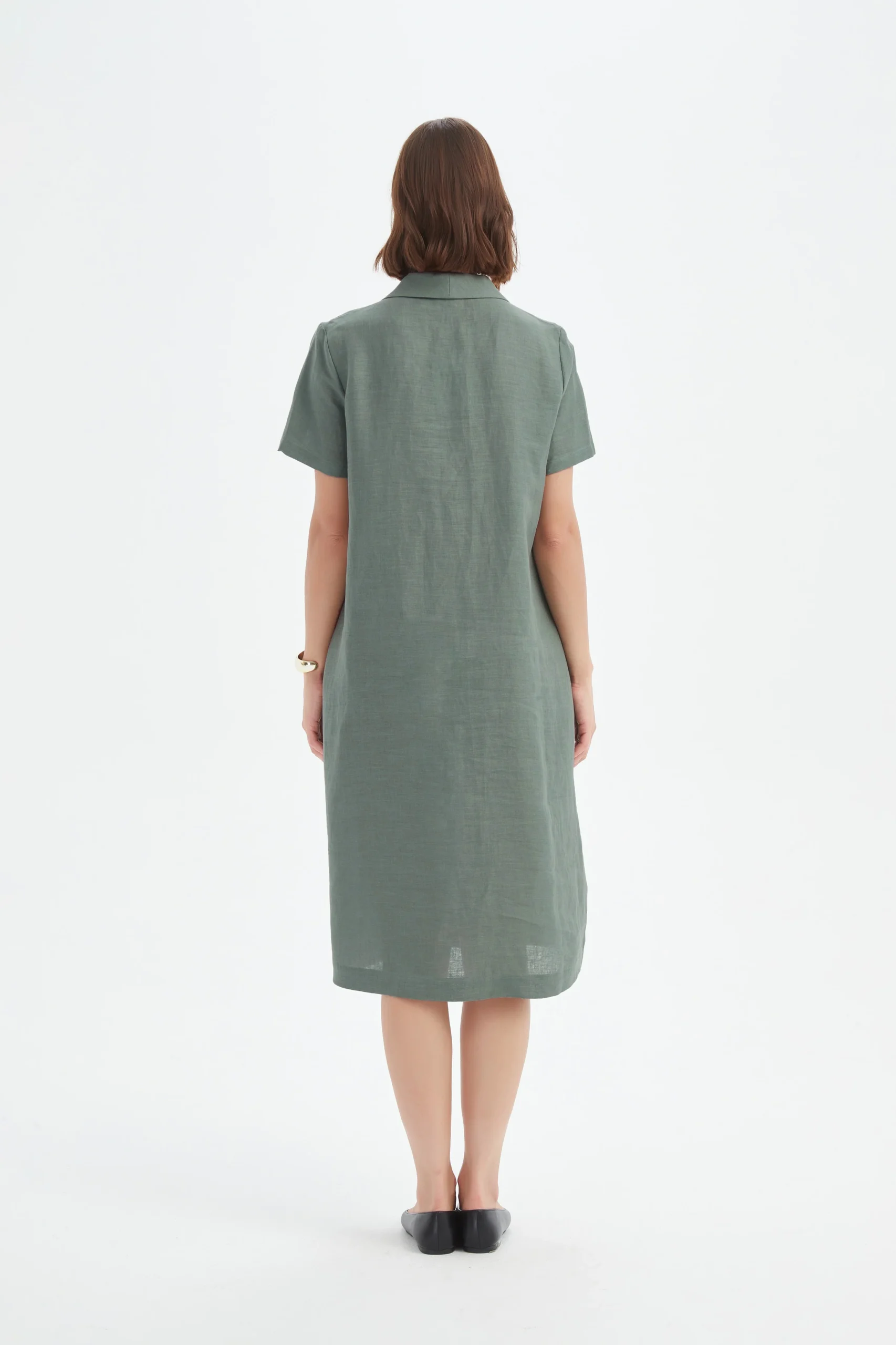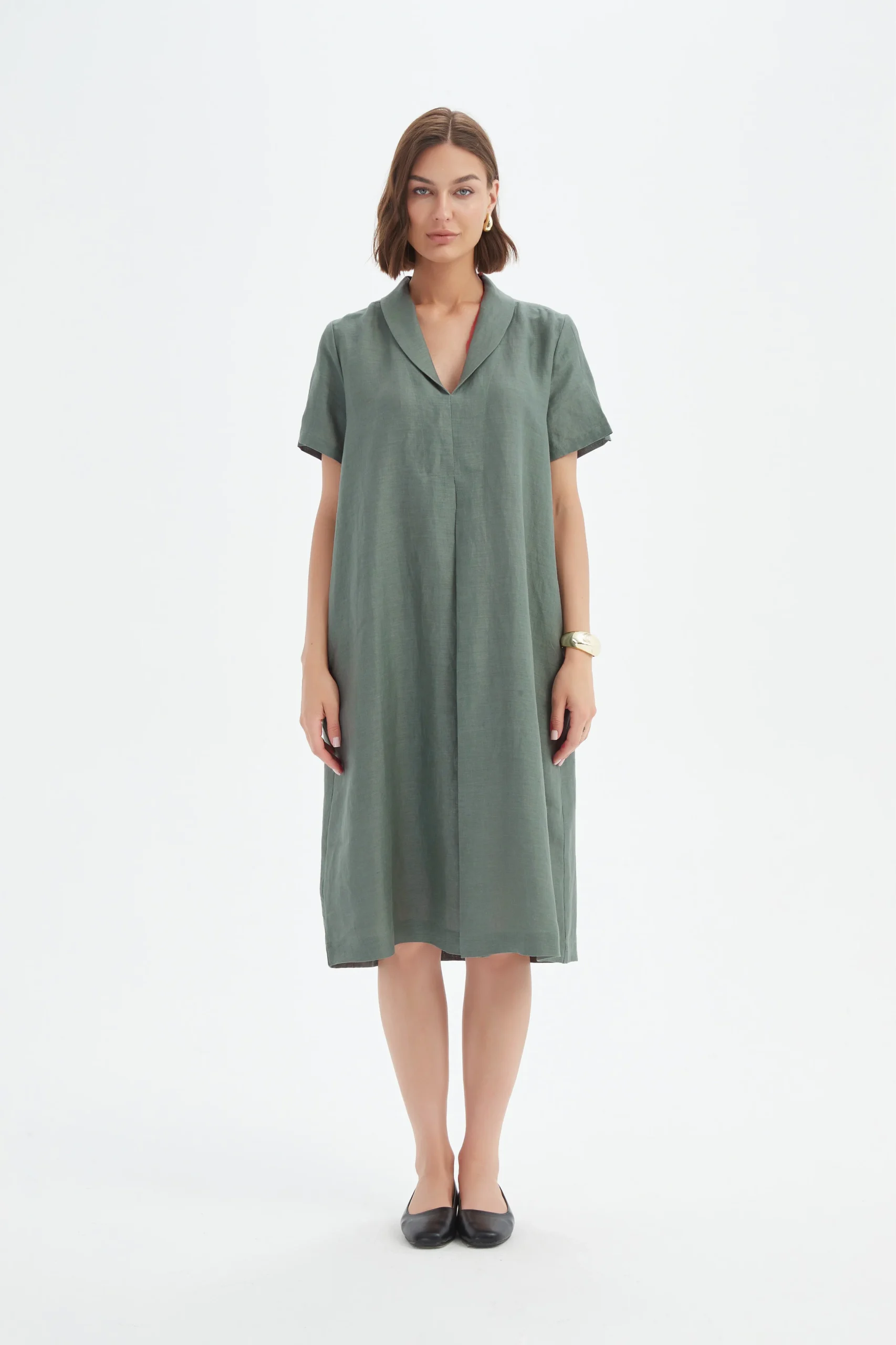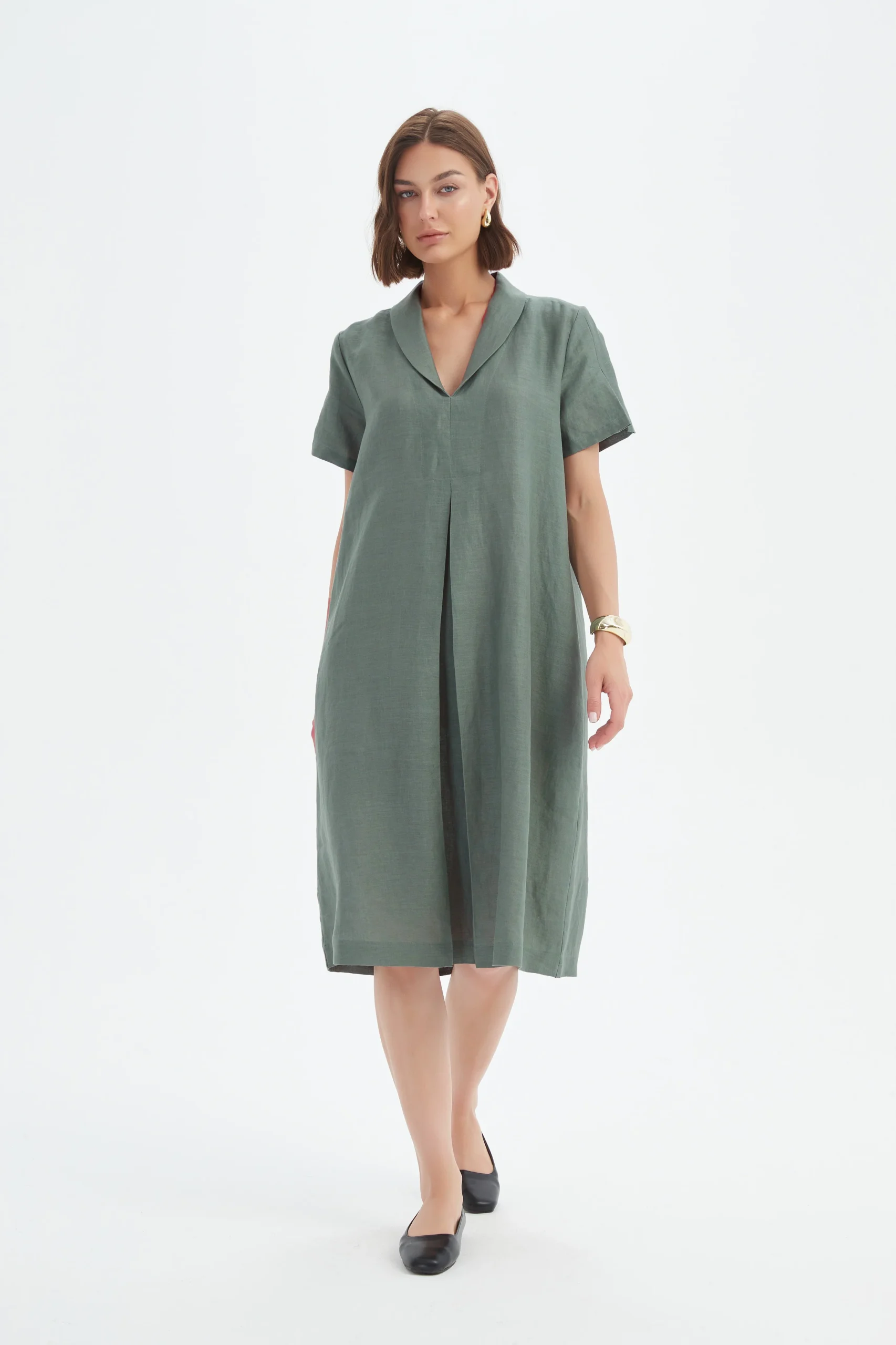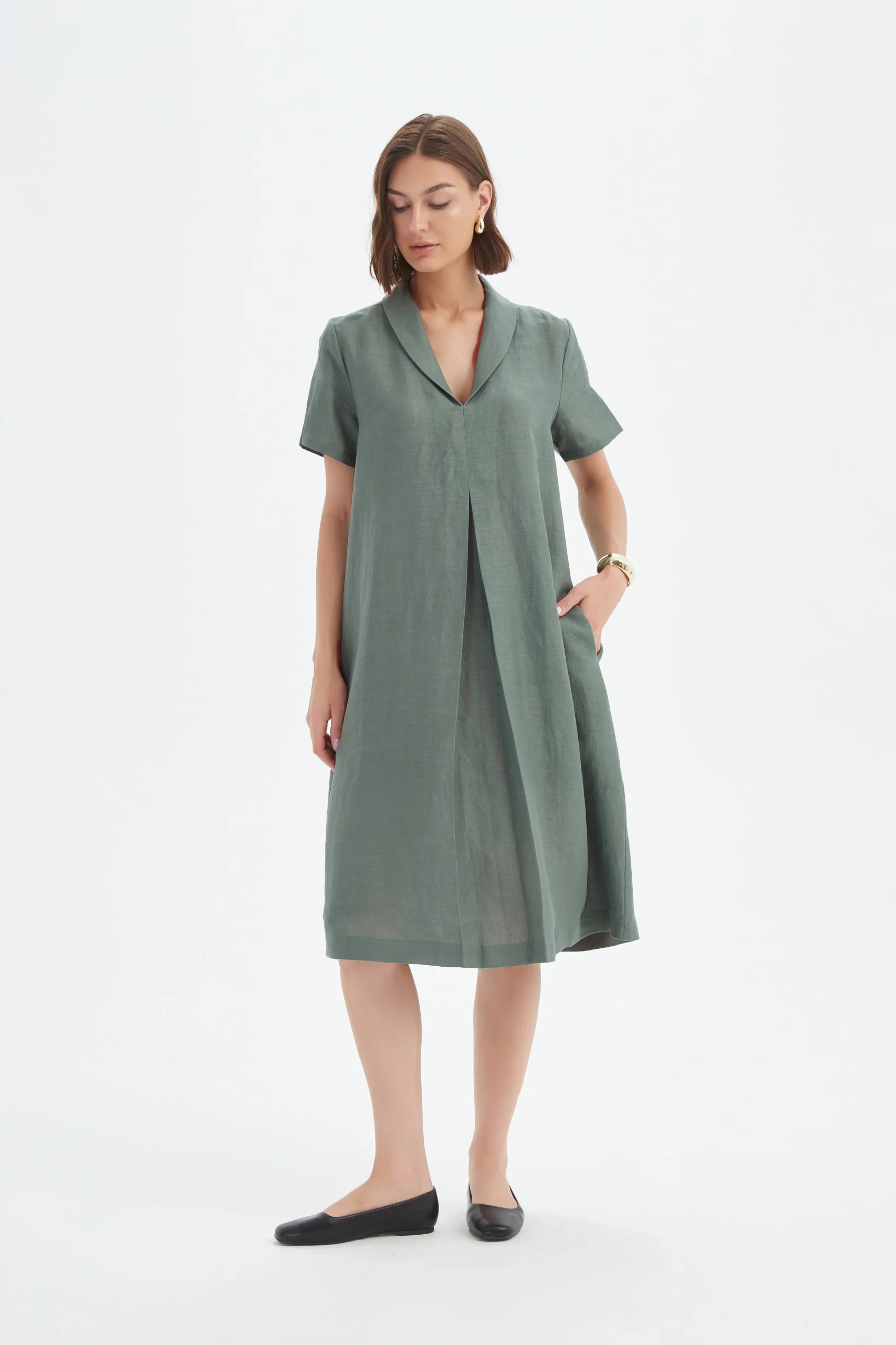 Tirelli Shawl Collar Pleat Linen Dress In Petrol