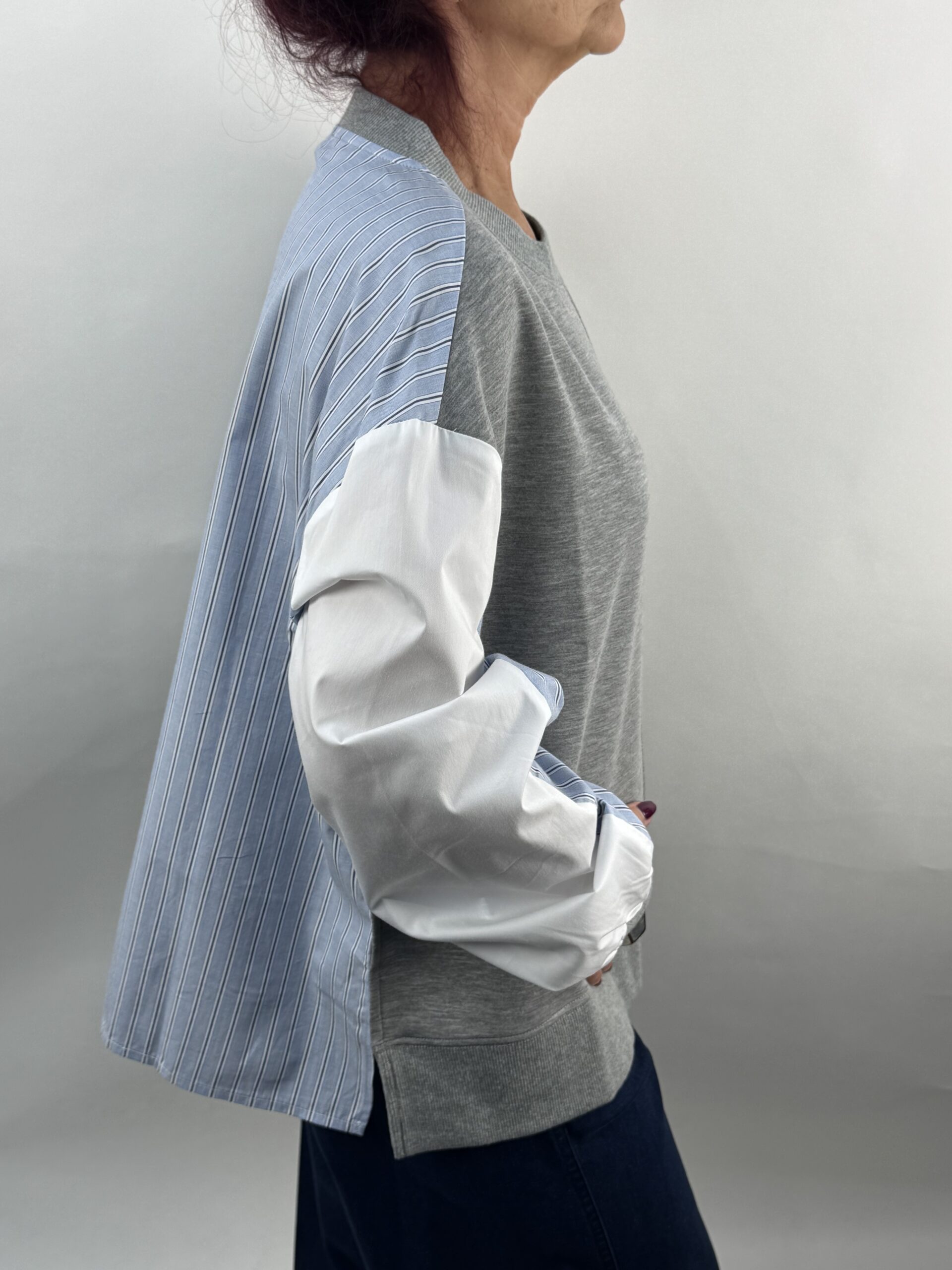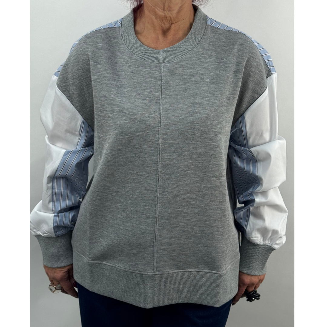 This is such a cool top!  A brilliant combination of a sweatshirt and a shirt: this top is just a little different with a sweatshirt style of round neck, easy fit to mid hip and long sleeves from a dropped shoulder, the sweatshirt material frontage is juxtaposed against the cotton shirt back and sleeves, which give it a stylish, chic vibe.  The ribbed hemline adds a causal feel and this top will pair with any trouser from denim to cords or tweed.  In pale grey marl to the front with white panels and baby blue stripes, this top is simply a great addition to any collection.  Brilliant!