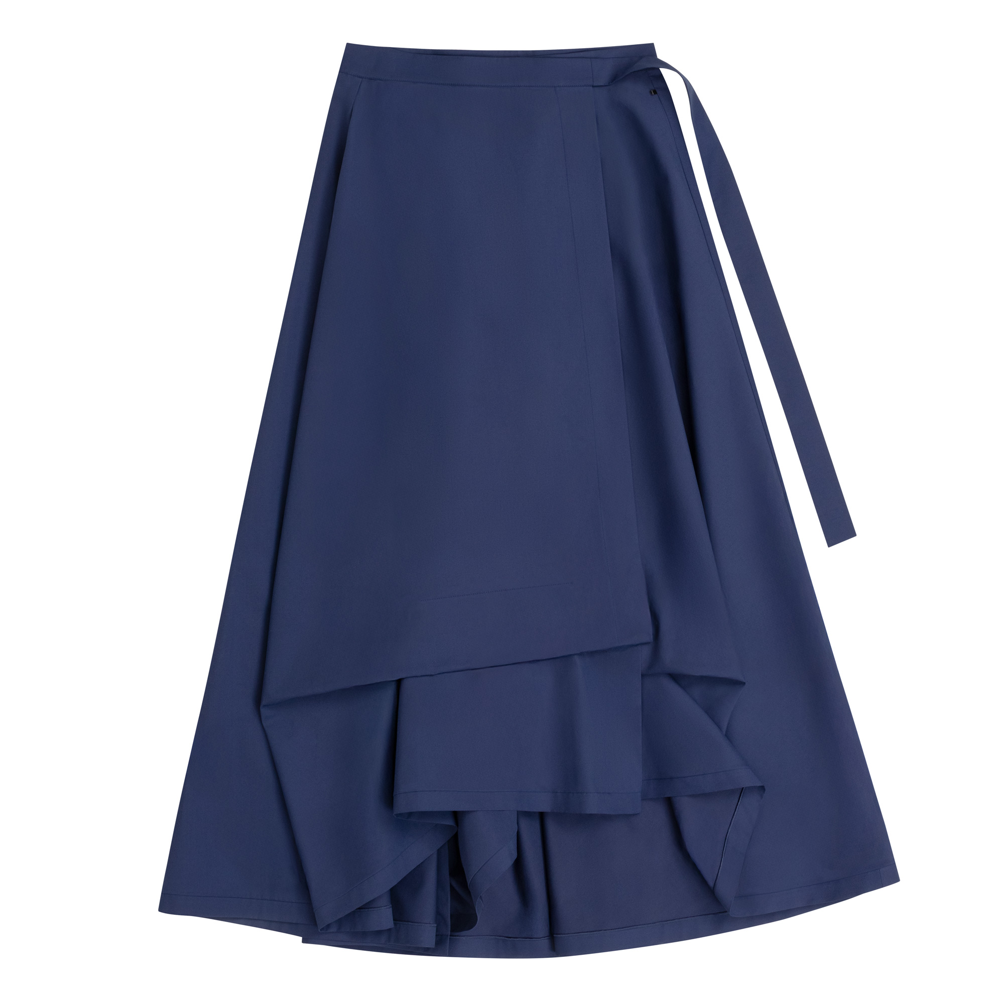 This beautiful skirt brings drama and movement while adding a contemporary and edgy feel.  In a wonderful indigo blue, this skirt has a wrap design with a narrow waistband and long ties; while the skirt shape is full, has an asymmetric hemline with a pleated and gathered detailing to the front which adds interest and sway.  This lovely piece is crafted in a gorgeous, smooth, pure cotton which makes it perfect for any outing this Spring/Summer season.  The long length gives this skirt a cool and hip vibe making it super chic and elegant.  Pair with a top in the same range for a head turning look.  Gorgeous with a capital G!