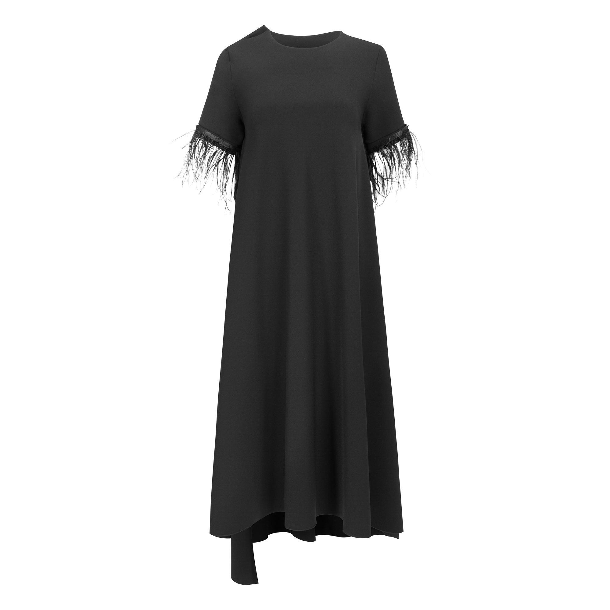 LBD to another level! This fabulous dress, crafted in a heavier crepe jersey, is packed with detail. The round neckline has a slit detail on the right shoulder and the skirt flares out to a wide A-line shape, allowing the dress to fall elegantly, yet to wish pleasingly. Mid-calf length on the front, the rear hemline drops dramatically