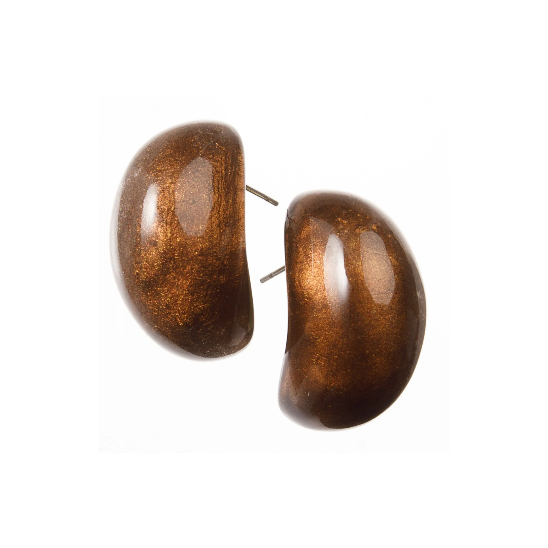 These gorgeous cute earrings are such a great colour to wear with all the browns, toffee and caramel tones that are so on trend this season. So effective, lightweight and comfortable to wear.  With a cognac bronze pearlescent look and a chubby half moon shape, they sit close to the cheek and look so chic and stylish.  This colour is captivating and will pair with a dark and neutral wardrobe alike.  A definite winner all round!